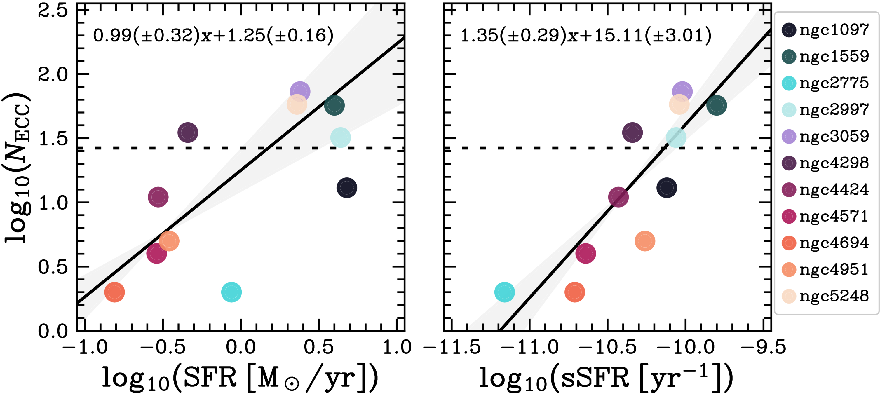 Number of embedded cluster candidates vs. global star formation properties. Values for each galaxy are in Table 1, and embedded cluster candidate counts from this study are in Table 4. Left: ﹩{{\rm{log}}}_{10}({\rm{SFR}})﹩ vs. number of embedded cluster candidates. Right: ﹩{{\rm{log}}}_{10}({\rm{sSFR}})﹩ vs. number of embedded cluster candidates. The black line in each plot shows the linear fit to the data with the ±1σ region of the fit in light gray. We exclude NGC 2997 and NGC 1097 in fitting due to a lack of wide coverage. The number of embedded cluster candidates positively correlates with each of these properties.
