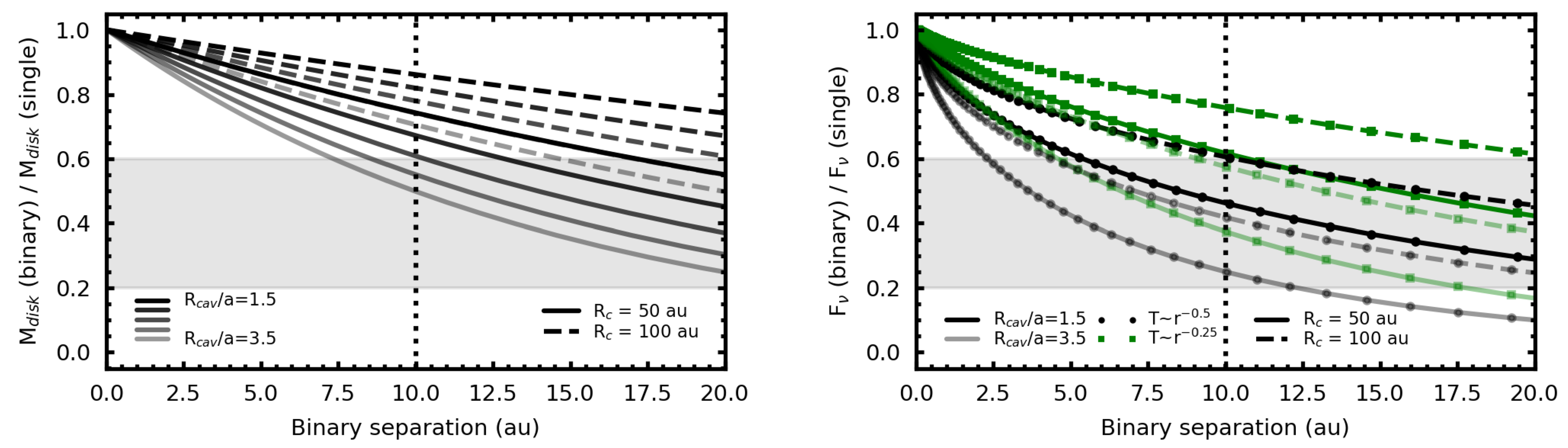 A central binary will remove some material, reducing the total disk mass (left panel) depending on the size of the disk (solid vs. dashed lines) and the size of the cavity (grayscale of the lines). The solid gray band represents our observed dust mass depletion. While the binary separations in our sample are not known, the spectroscopic resolution in the surveys used to define our sample limits the sample to separations <10 au, indicated by the vertical dotted line. By carving out the inner disk, the binary also changes the average temperature of the disk, which, in combination with the removed disk mass, reduces the observed dust disk flux (right panel). A central clearing associated with the binary can explain the observed disk only for relatively large binary separations in compact disks with large cavities and steep temperature profiles.