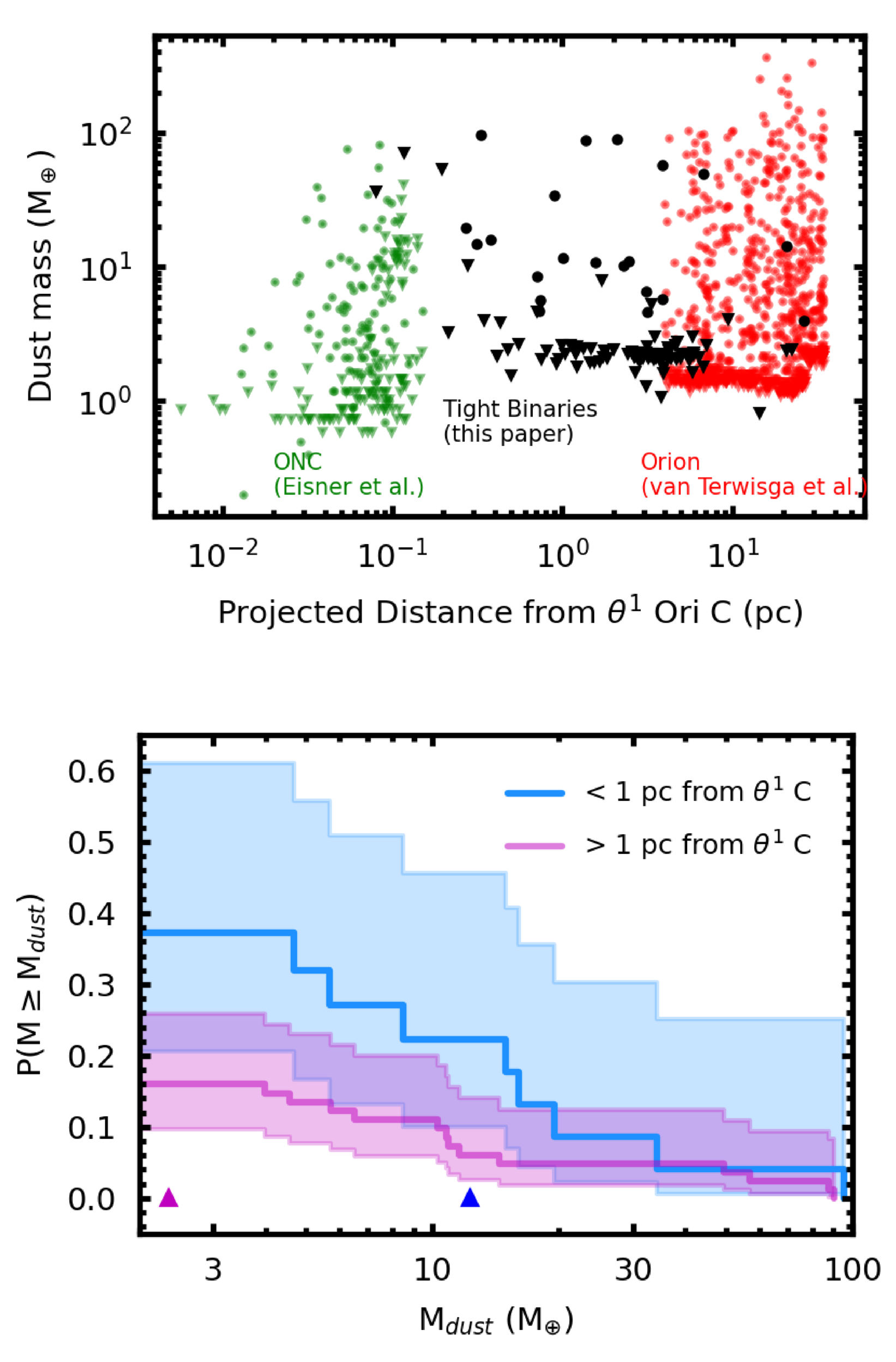 Top: dust mass as a function of projected distance from θ1 Ori C for the tight binaries studied here (black points), ONC targets (green points, J. A. Eisner et al. 2018), and targets from across the Orion cloud (red points, S. E. van Terwisga et al. 2022). The vast majority of the tight binaries fall beyond the region within 0.1 pc that J. A. Eisner et al. (2018) identified as being affected by external photoevaporation. Bottom: disk dust mass distributions comparing tight binaries within 1 pc of θ1 Ori C and more distant sources. Sources close to θ1 Ori C show slightly higher masses, most likely due to the diminished sensitivity in a region with higher background emission; triangles indicate average upper limits for the corresponding samples.