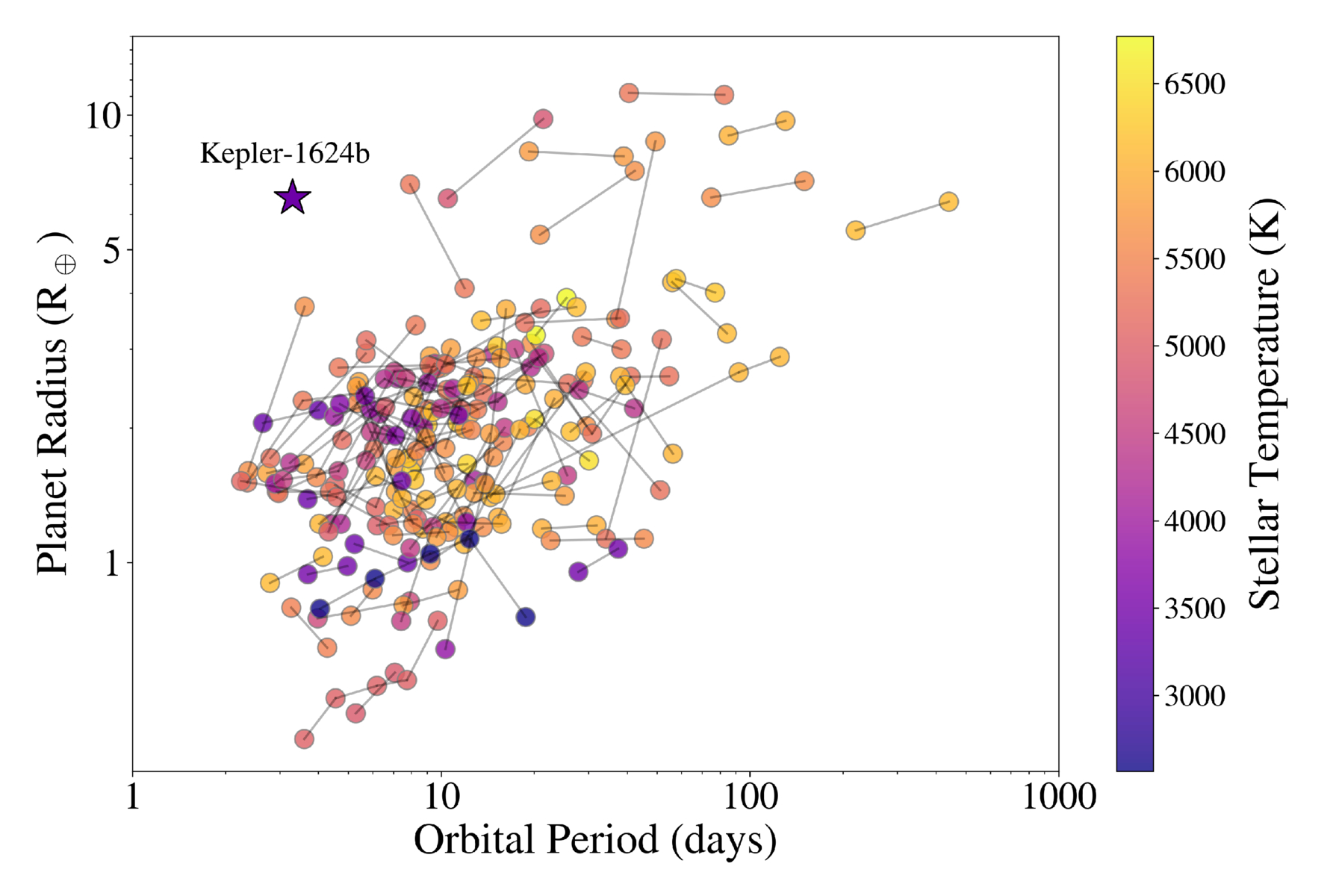 Orbital period vs. planet radius for all planet pairs with period ratios within 2% of a first-order resonance. The colors of the points indicate the effective temperature of the host star, and each planet pair is connected by a solid black line. The location of Kepler-1624b in this space is marked by a star. This plot was generated using data from the NASA Exoplanet Archive (R. L. Akeson et al. 2013).