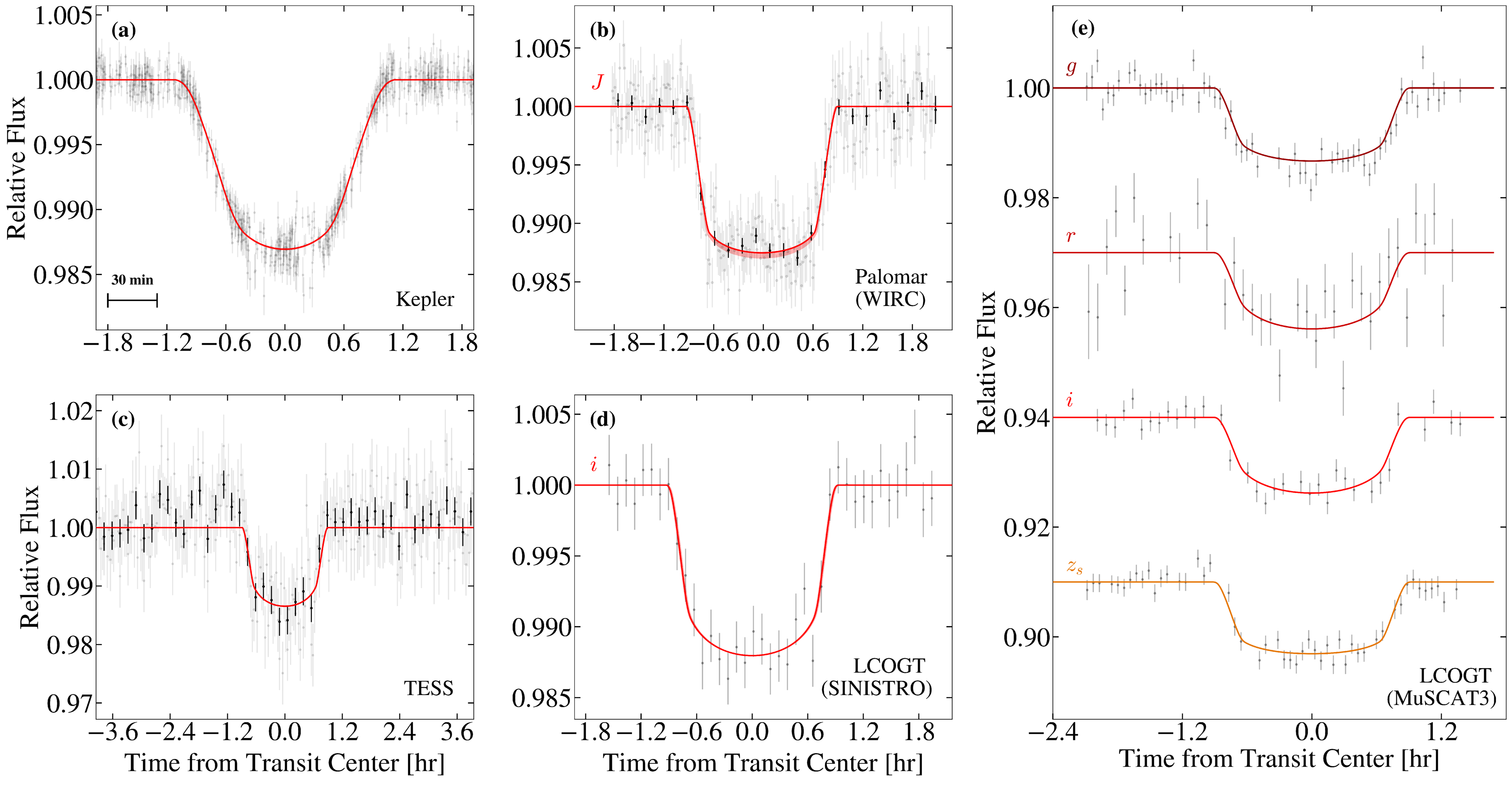 Transit light curves for Kepler-1624b from multiple instruments. (a) Kepler, (b) Palomar/WIRC, (c) TESS, (d) LCOGT/SINISTRO i band, and (e) LCOGT/MuSCAT3 multiband. For Kepler, the light curves of individual transits are phased up using the individual best-fit transit times. For TESS, we phase individual transits using transit times from the best-fit one-planet model. For (a), the gray points show unbinned phased data, where each point corresponds to a 30 minute integration. For (b), unbinned photometry is shown as gray circles, and 10 minute binned photometry is shown as black circles. For (c), we use 10 minute bins for the black points and 2 minute bins for the gray points. For (d), we show the unbinned data as gray points. For (a)–(d), the best-fit transit light curves are overplotted in red, with the 1σ confidence range overplotted as light red shading. For (e), transits in g, r, i, and zs bands are plotted with different colors with an arbitrary vertical offset, and the gray points represent the observed data, while the colored lines show the best-fit transit model for each band with a 1σ confidence range overplotted with the corresponding color of shading. For some of the panels, the 1σ confidence shading is not visually noticeable due to very tight confidence ranges.