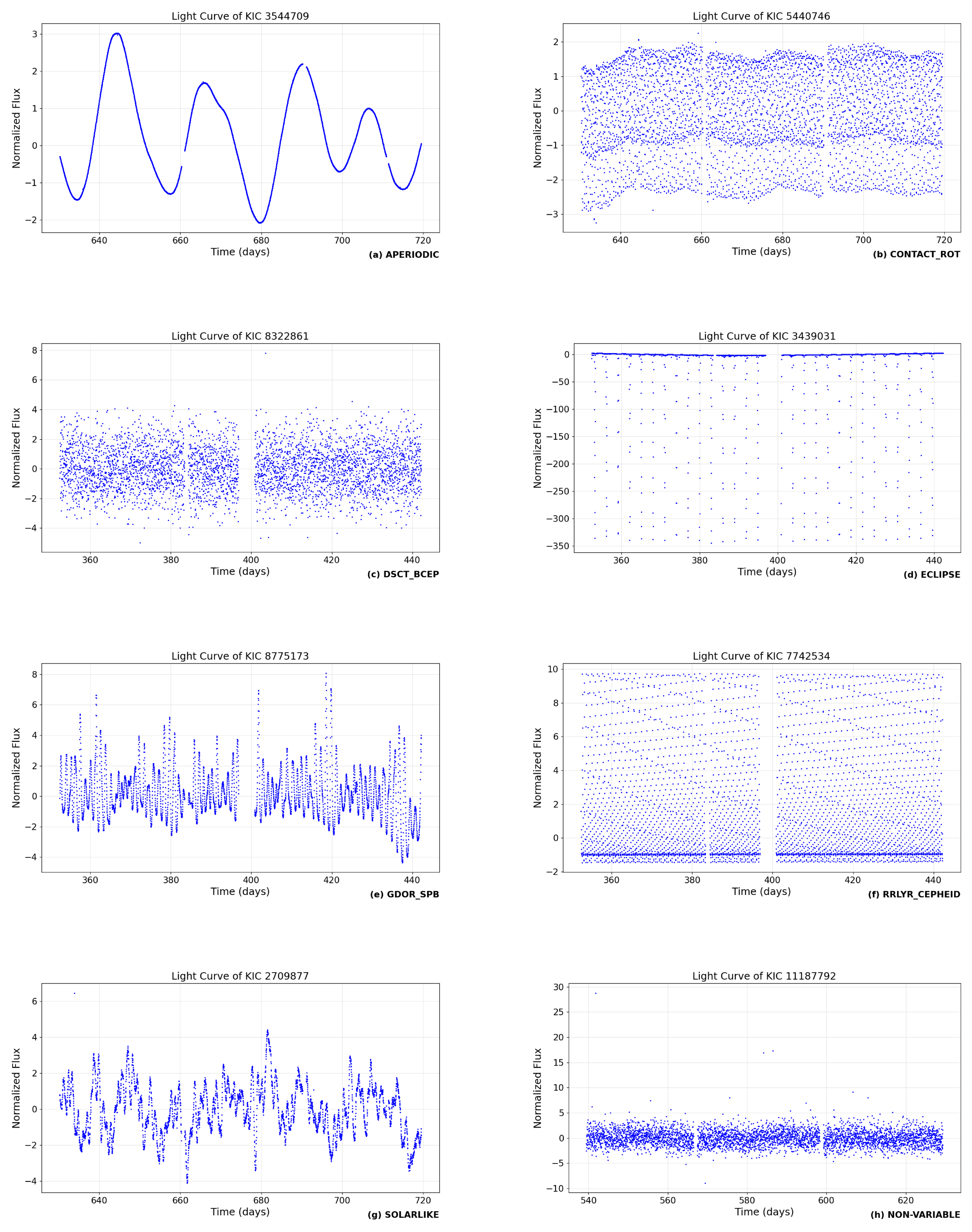Light curves of different classes derived from FITS files obtained via MAST from a single quarter of Kepler observations. Panels are labeled as (a) APERIODIC, (b) CONTACT ROT, (c) DSCT BCEP, (d) ECLIPSE, (e) SOLARLIKE, (f) GDOR SPB, (g) RRLYR CEPHEID, and (h) NONVARIABLE. Visible gaps in some light curves are due to observational or instrumental effects.
