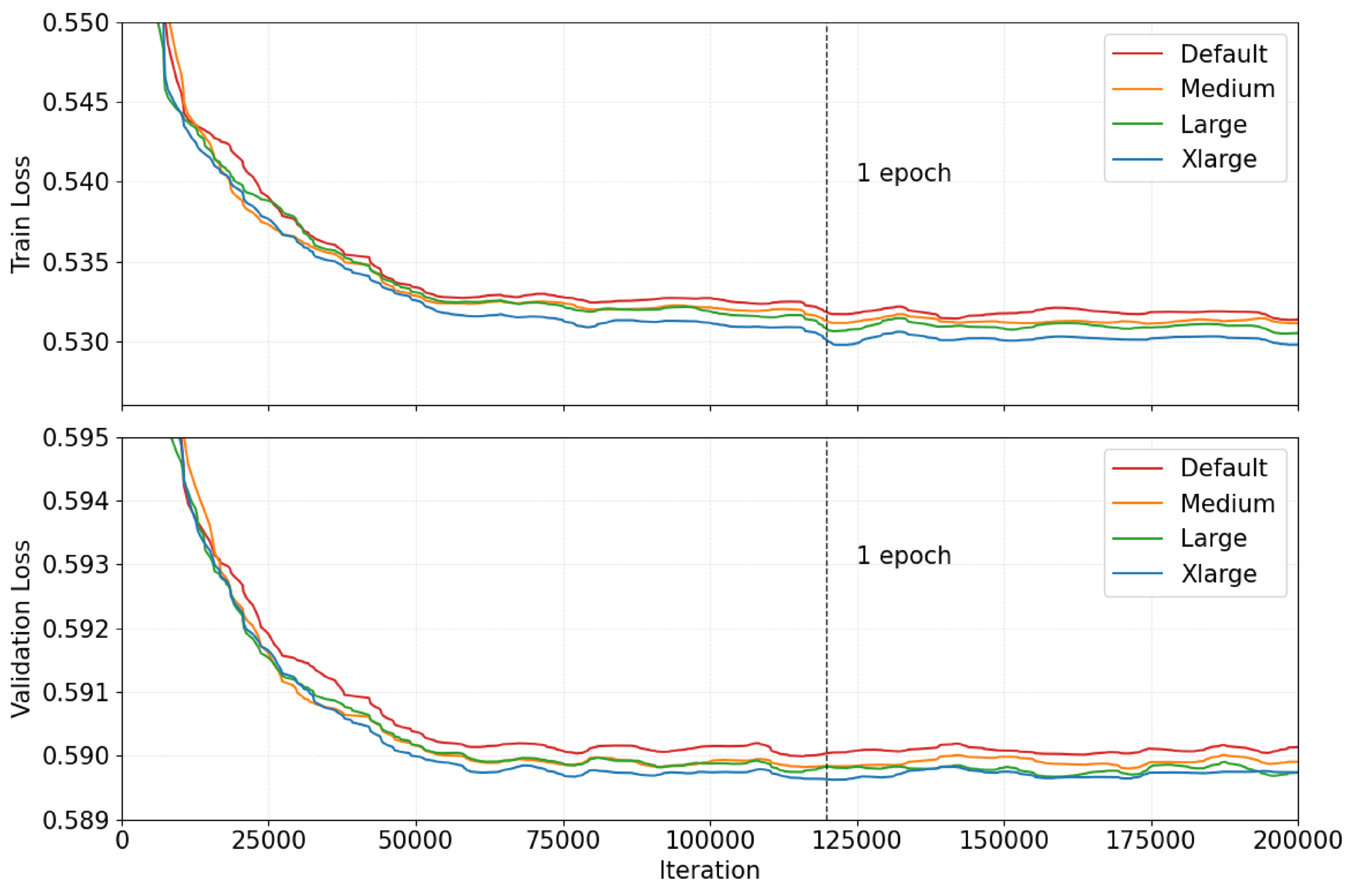 Training and validation loss curves during model training for models of different parameter scales. The vertical dashed line indicates the end of the first epoch (119,850 iterations), which corresponds to the checkpoint used for analysis.