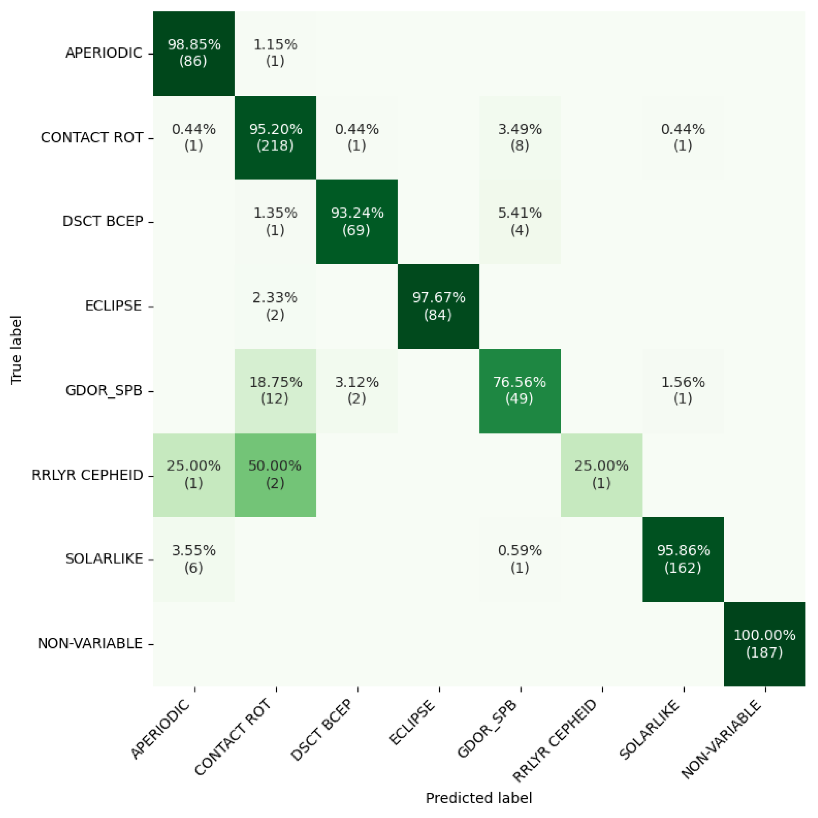 Confusion matrix for stellar variability classification in the context of XLarge-200, where the labeling scheme differs by including the NONVARIABLE class and excluding the INSTRUMENT class. Each cell similarly presents the percentage and absolute number of instances, with darker diagonal cells indicating higher classification accuracy. Compared to Figure 7, the introduction of the NONVARIABLE category shifts some borderline cases and slightly alters the distribution of misclassifications among closely related classes.