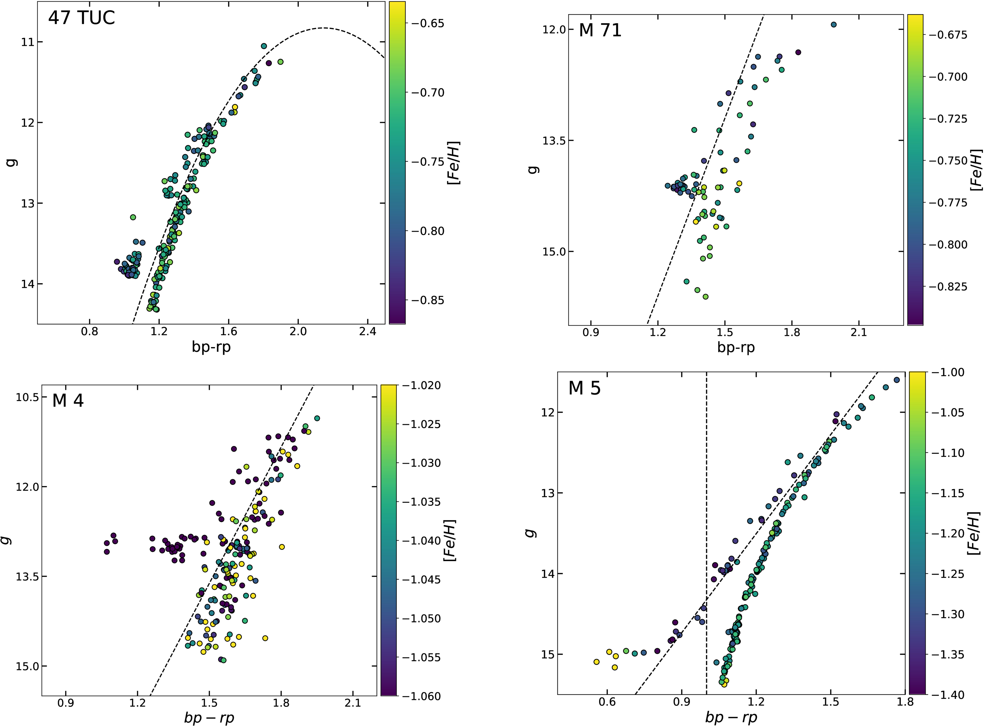 Gaia color–magnitude diagram for globular clusters 47 TUC, M 71, M 4, and M 5 colored by [Fe/H]. Black dashed lines represent the polynomial functions used to separate RGB from red clump and AGB members of each cluster. Note the magnitude errors are smaller than the markers.