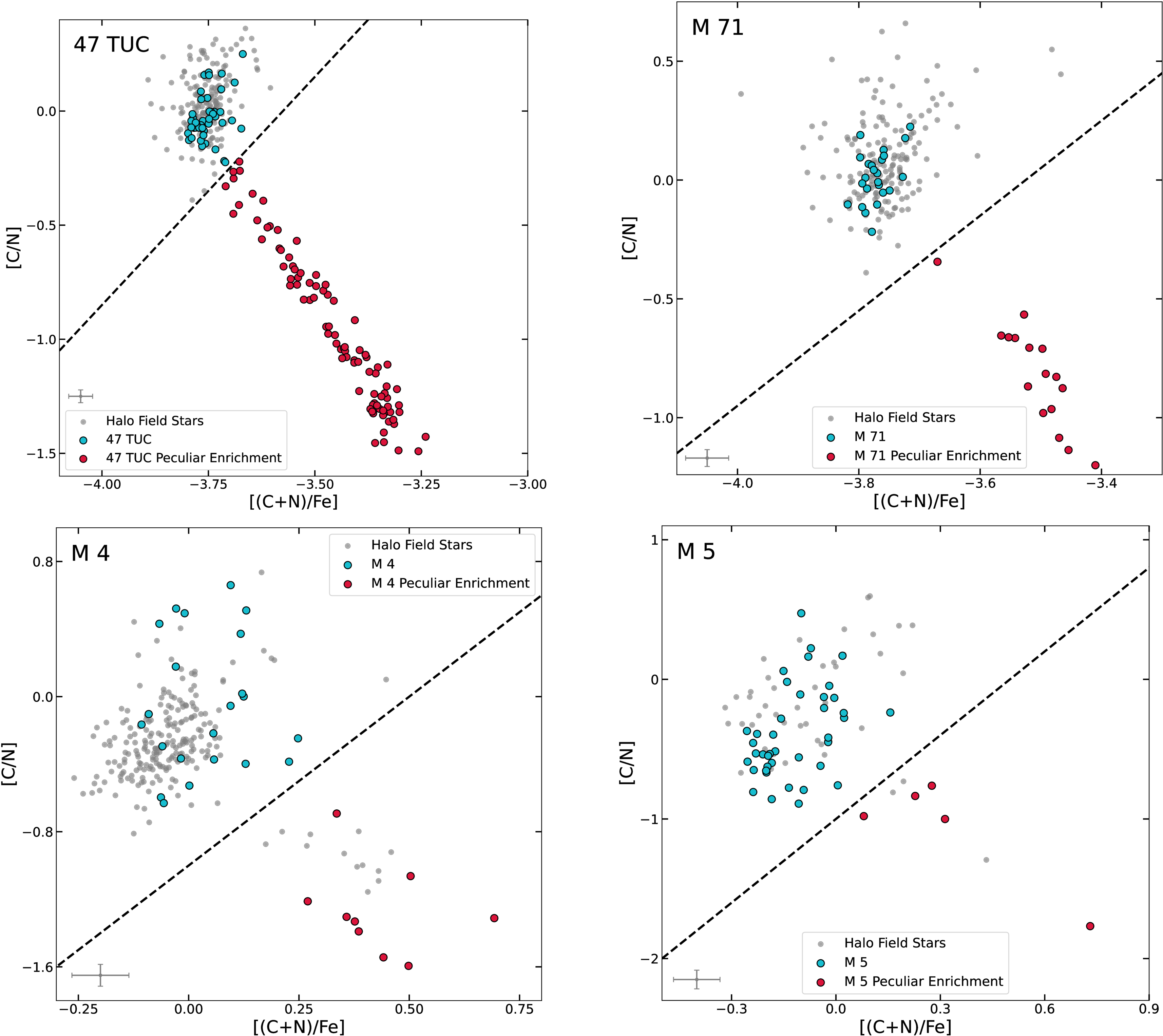 [C/N] versus [C+N/Fe] plots for globular clusters 47 TUC, M 71, M 4, and M 5. Light-gray dots are APOGEE halo field stars with similar Mg and Fe abundances to the cluster. Stars outlined in black are members of the respective cluster, where those colored in red are considered peculiar enriched stars within the cluster, while those colored in cyan are those that are not peculiar and are similar to the field stars. The black dashed line represents the cut we did to remove the peculiar stars from the calibration sample. A representative error bar is shown in the bottom-left corner of each panel for each cluster.