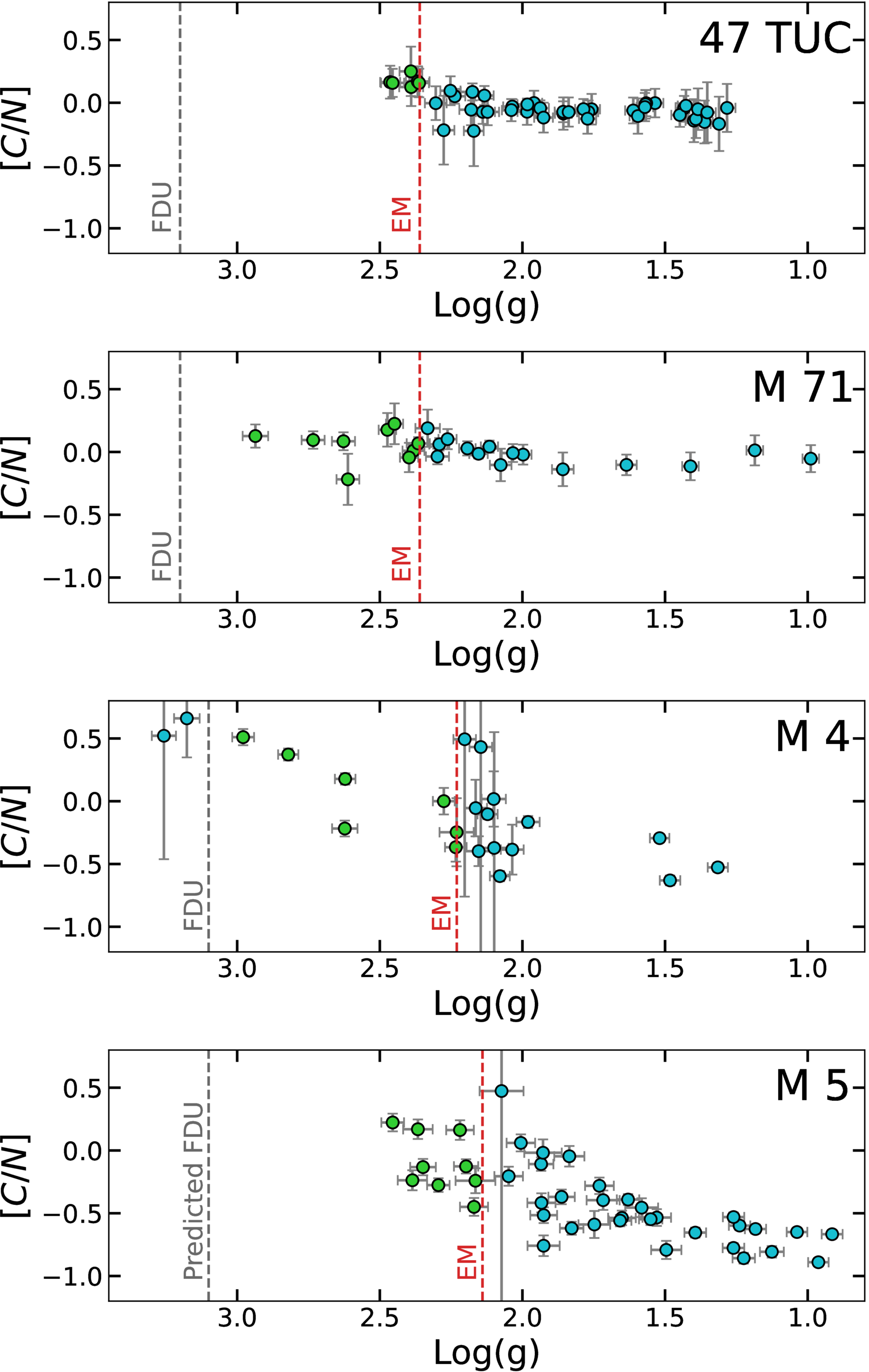 Log(g) versus [C/N] plot of first population of stars without peculiar enrichment. These are the same stars from Figure 4 shown in cyan. Stars used in our calibration are shown in green. The gray vertical dashed line and vertical red dashed line represent the FDU log(g) cut and extramixing (EM), respectively, from Table 2 of M. Shetrone et al. (2019).