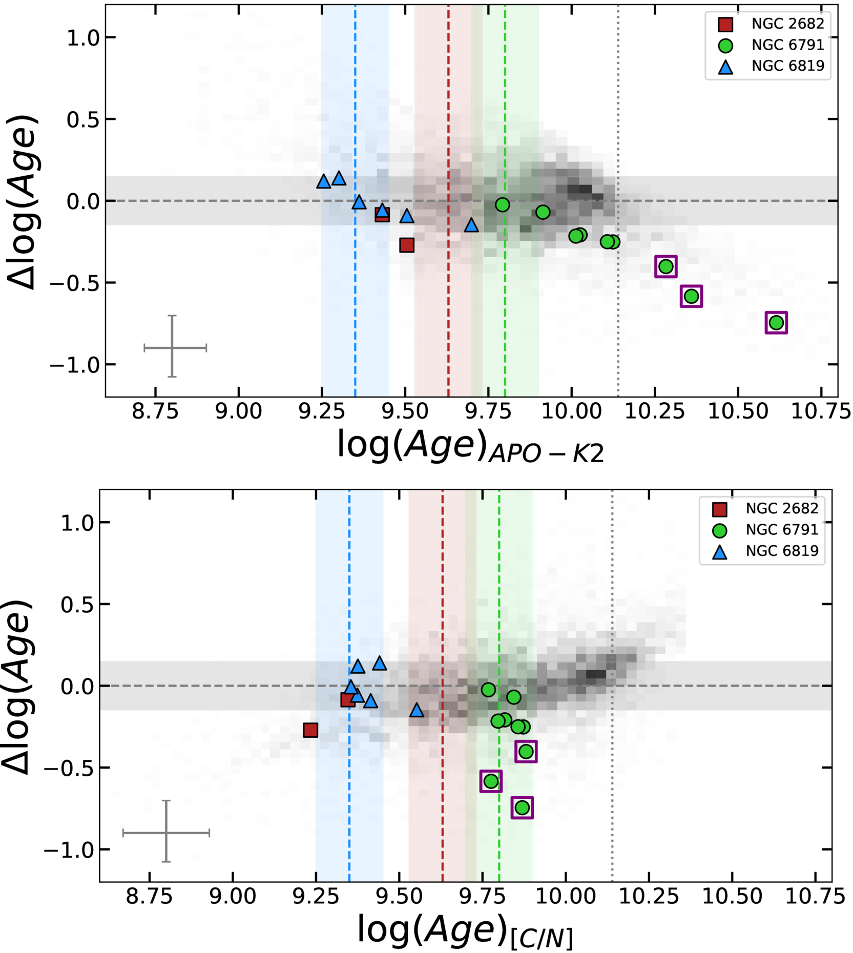 ﹩{\rm{\Delta }}\mathrm{log}\,(\mathrm{Age})﹩ as a function of APO-K2 log (age) (top) and [C/N]-based log (age) (bottom). The gray gradient shaded regions represent bins of field stars; darker bins imply more stars. The red squares, green circles, and blue triangles represent cluster member stars common to samples NGC 2682 (M 67), NGC 6791, and NGC 6819, respectively. The vertical dashed lines are the T. Cantat-Gaudin et al. (2020)–determined ages for each cluster, and the respective shaded regions show the error in cluster age. The horizontal gray dashed line is where ﹩{\rm{\Delta }}\mathrm{log}\,(\mathrm{Age})=0﹩, with the surrounding gray region representing a delta of −0.1 and +0.1. The vertical gray dotted line shows the accepted age of the Universe. Median representative error bars are shown in each panel. Clusters member older than the Universe, highlighted with a purple square, were found to be in a binary system (A. M. Price-Whelan et al. 2020).