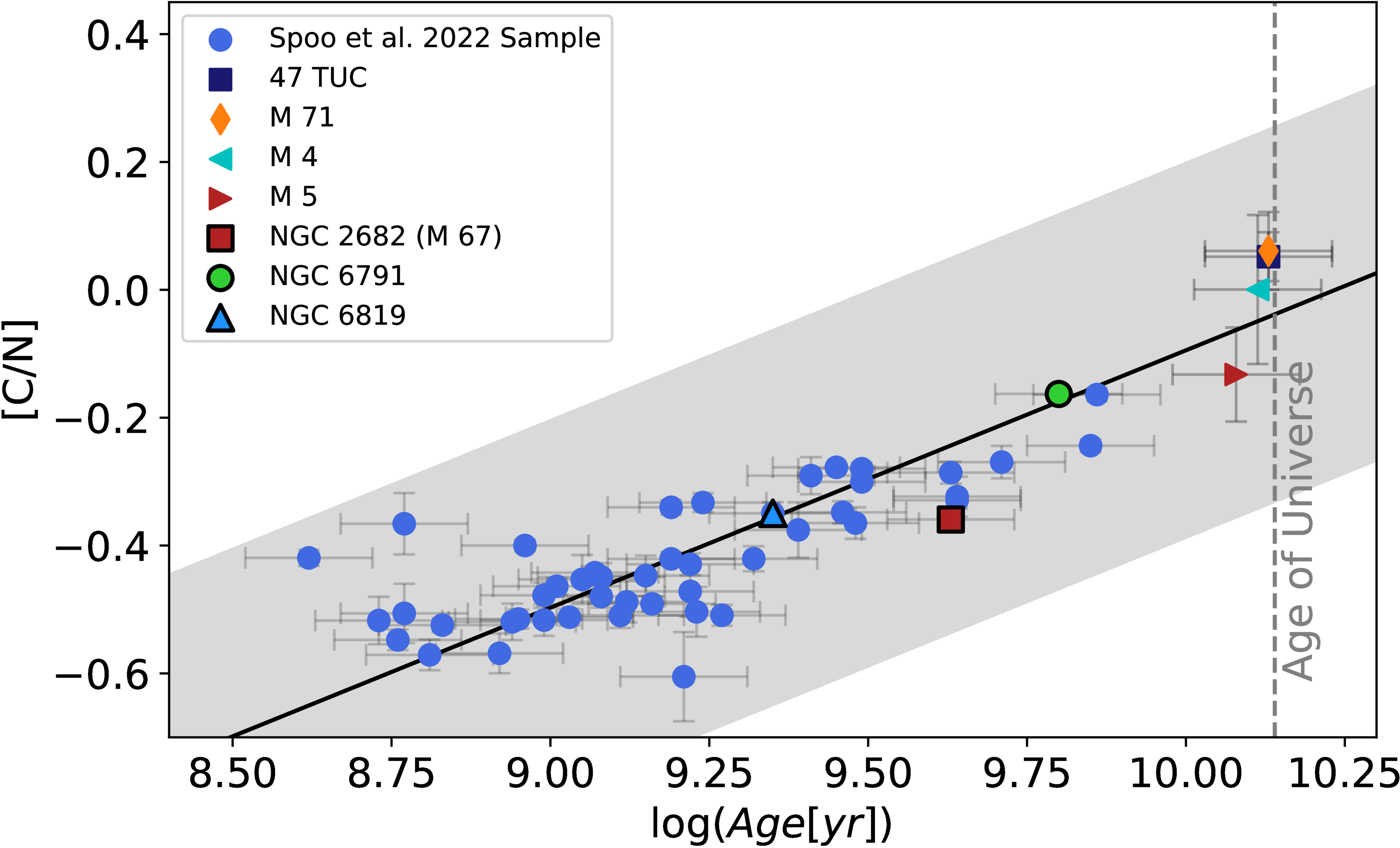 The [C/N] versus ﹩\mathrm{log}\,(\mathrm{Age}[\mathrm{yr}])﹩ distribution for the final sample, composed of T. Spoo et al. (2022) open cluster sample and globular clusters 47 TUC, M 71, M 4, and M 5. Clusters represented by blue circles are from the final calibration sample of T. Spoo et al. (2022). Globular clusters 47 TUC, M 71, M 4, and M 5 are represented with an indigo square, an orange thin diamond, a cyan left triangle, and a red right triangle, respectively. Our new linear fit is shown as a solid black line, and the fit’s error envelope is shown with the gray region. The accepted age of the Universe is shown as a vertical gray dashed line. The open clusters used in our asteroseismic age comparison are NGC 2682 (M 67), NGC 6791, and NGC 6819 and are shown by a black-outlined red square, green circle, and blue triangle, respectively.