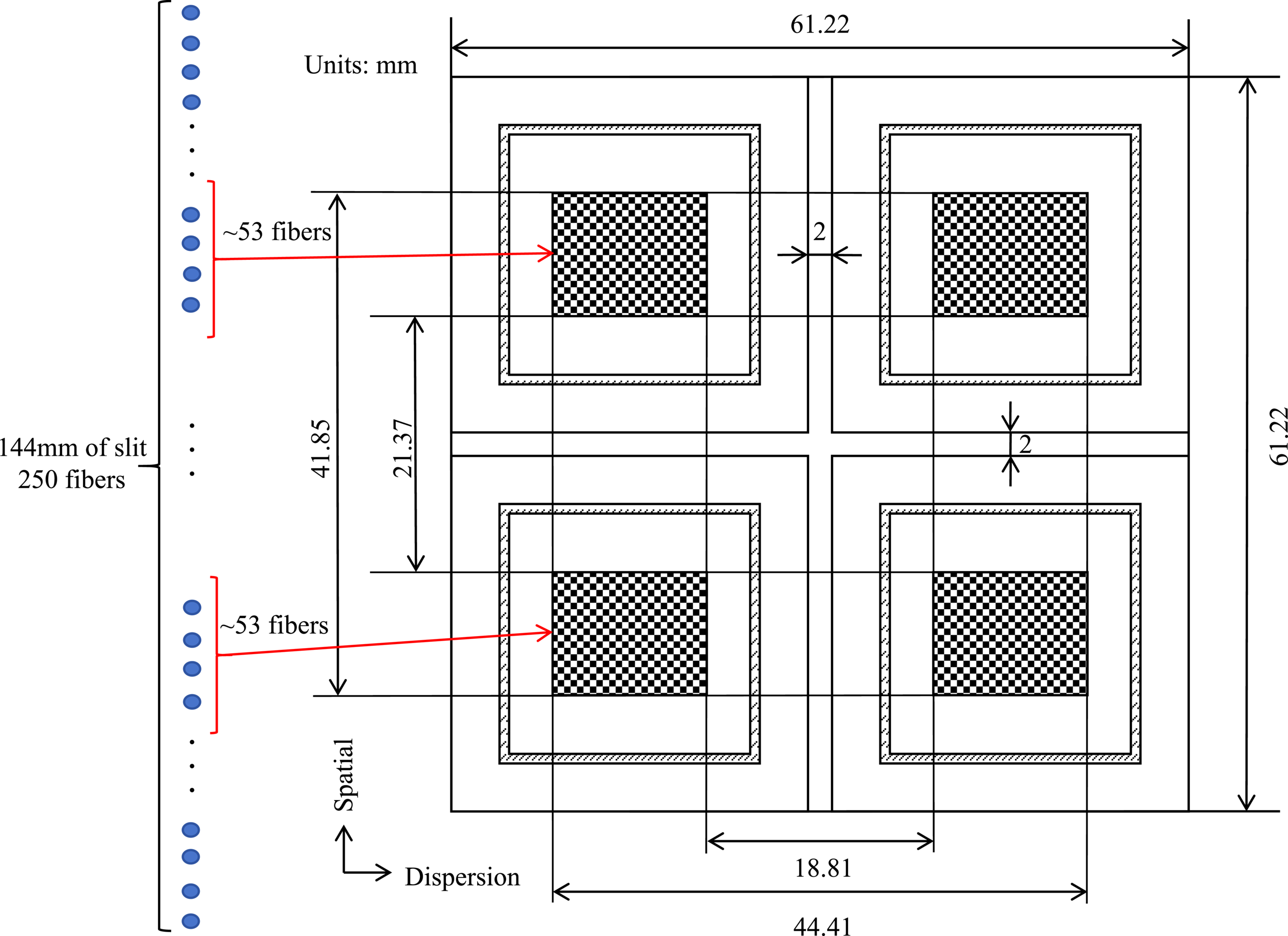 Layout and fiber capacity of the 2 × 2 NIR detector mosaic. The focal plane consists of a 2 × 2 mosaic of four detectors (each 640 × 512 pixels with a 20 μm pixel pitch) within a mechanical envelope of 61.22 × 61.22 mm2. The total effective light-sensitive area measures 25.6 mm (dispersion) × 20.48 mm (spatial). Along the spatial direction, a single detector accommodates 53 fibers, yielding a total capacity of 106 fibers for the entire mosaic, which satisfies the multiplexing requirements for multiobject NIR spectroscopic observations with the spectrograph prototype.