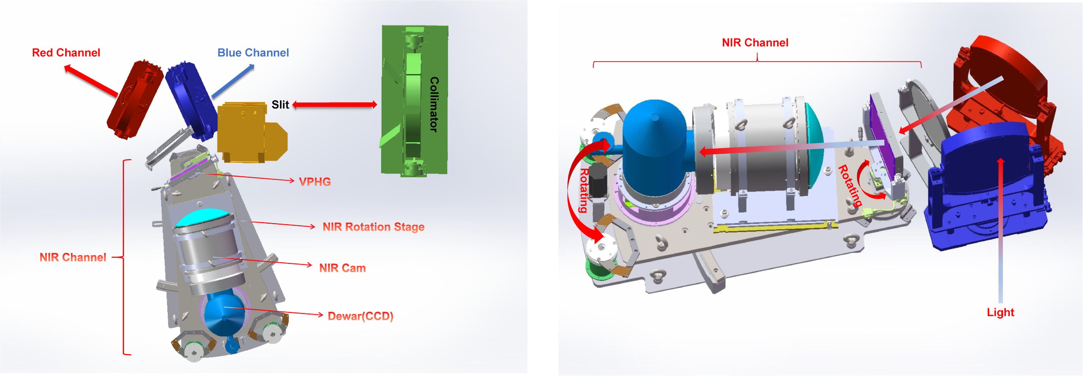 Three-dimensional structure (left) and working principle (right) of the LAMOST NIR spectrograph prototype. The right panel illustrates the light path: light from the slit is collimated and then split by the blue and NIR dichroic mirrors, with NIR light being reflected into the NIR channel. The core of the NIR channel is an integrated rotary stage housing the VPH grating, camera, and dewar. A coordinated rotation of the grating (independent) and the entire stage enables the system to maintain the grating blaze angle at optimal efficiency for different wavelengths. Brakes at the rear of the stage lock the position after adjustment to ensure operational stability.