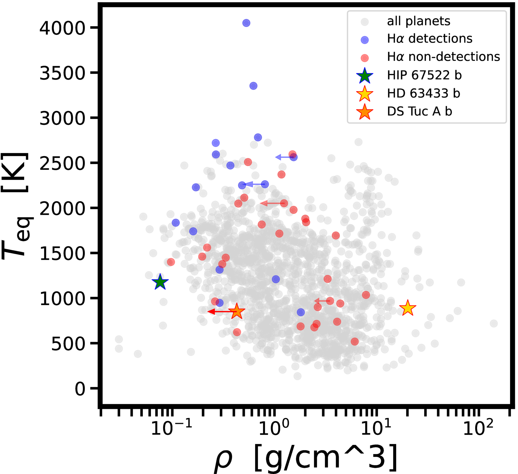 Planetary equilibrium temperature versus planetary density for targets with Hα observations. Detections are shown in blue, with non-detections in red; the three targets considered here are shown as colored stars (outline for detection/nondetection). This plot suggests the major deciding factor is low ρ and high Teq more than age. However, age and density are correlated as <200 Myr planets planets are known to be puffier than their older counterparts (S. Vach et al. 2024).