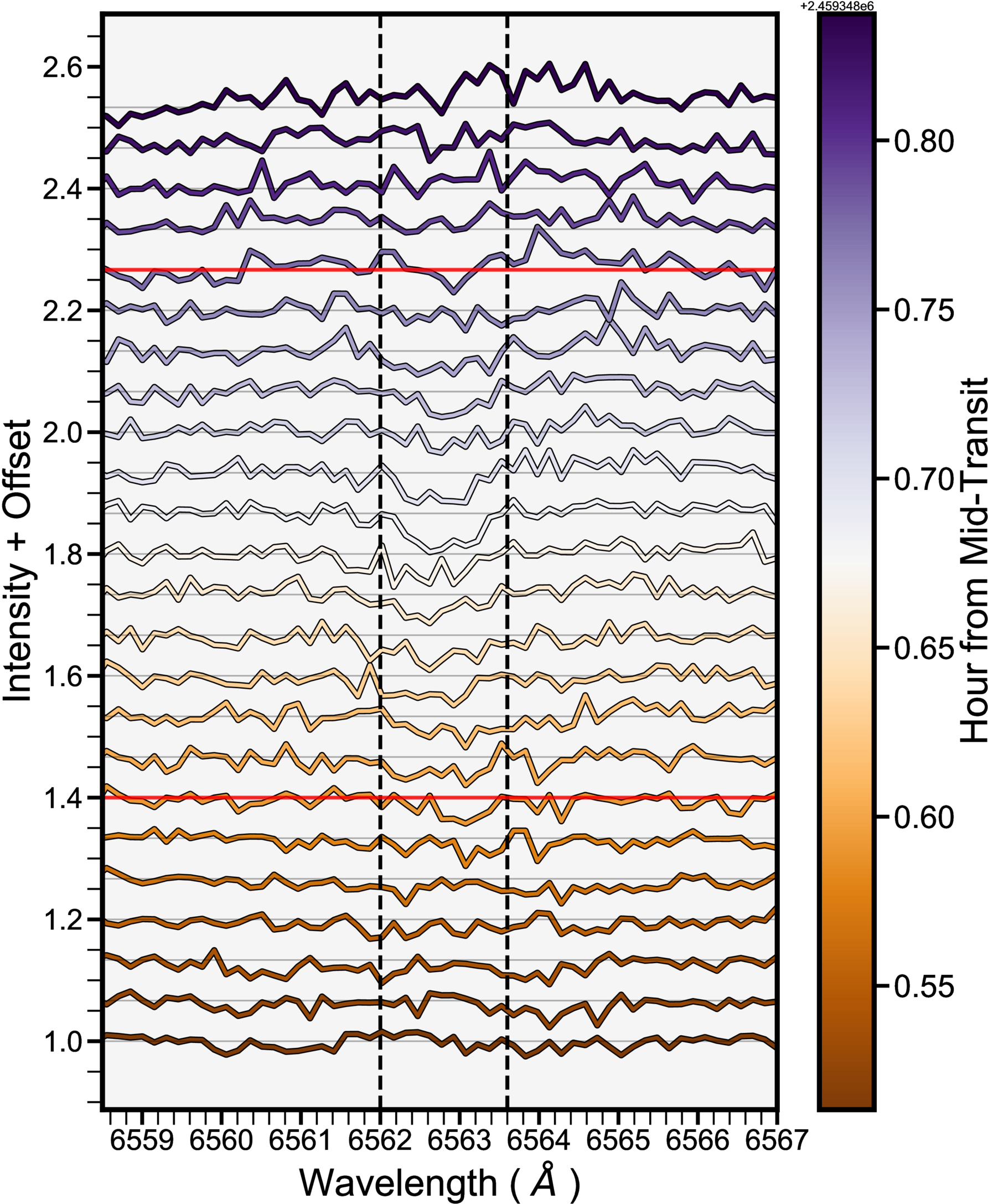 The time evolution of the reduced and template-corrected spectra for HIP 67522 b spanning observations on 2021 May 14 UT. The color bar shows the time of observation relative to the predicted midpoint of the transit. The lines in red denote ingress and egress. The vertical dashed lines mark the region used to calculate the equivalent widths.