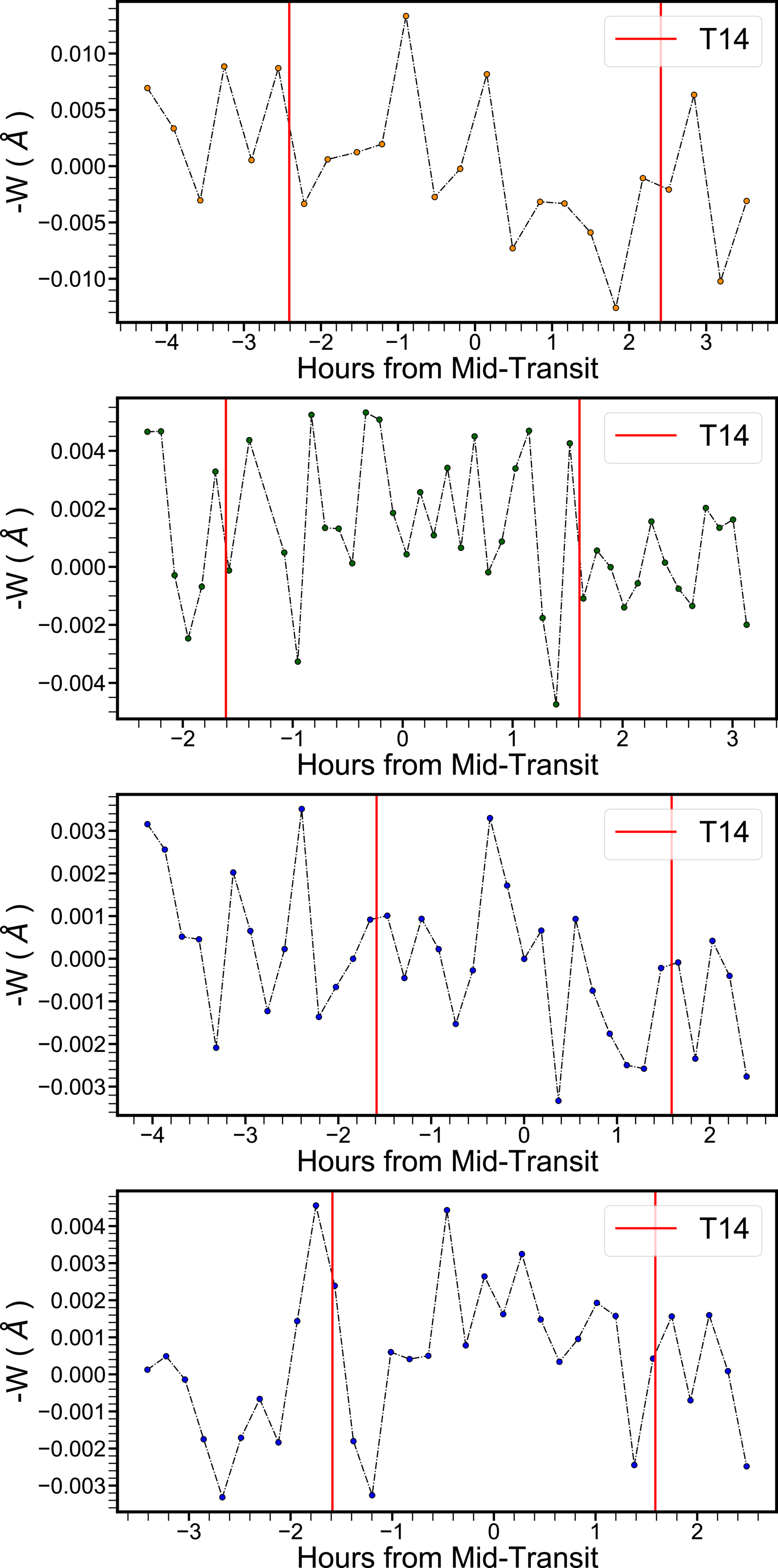 The equivalent widths of the Ca I absorption feature located near 6103 Å plotted against the time of observation in relation to the predicted transit times for HIP 67522 b, HD 63433 b, and two nights for DS Tuc A b in descending order. The transit ingress and egress are marked by the vertical red lines. This feature is relatively stable within uncertainties, indicating no detections of atmospheric calcium.