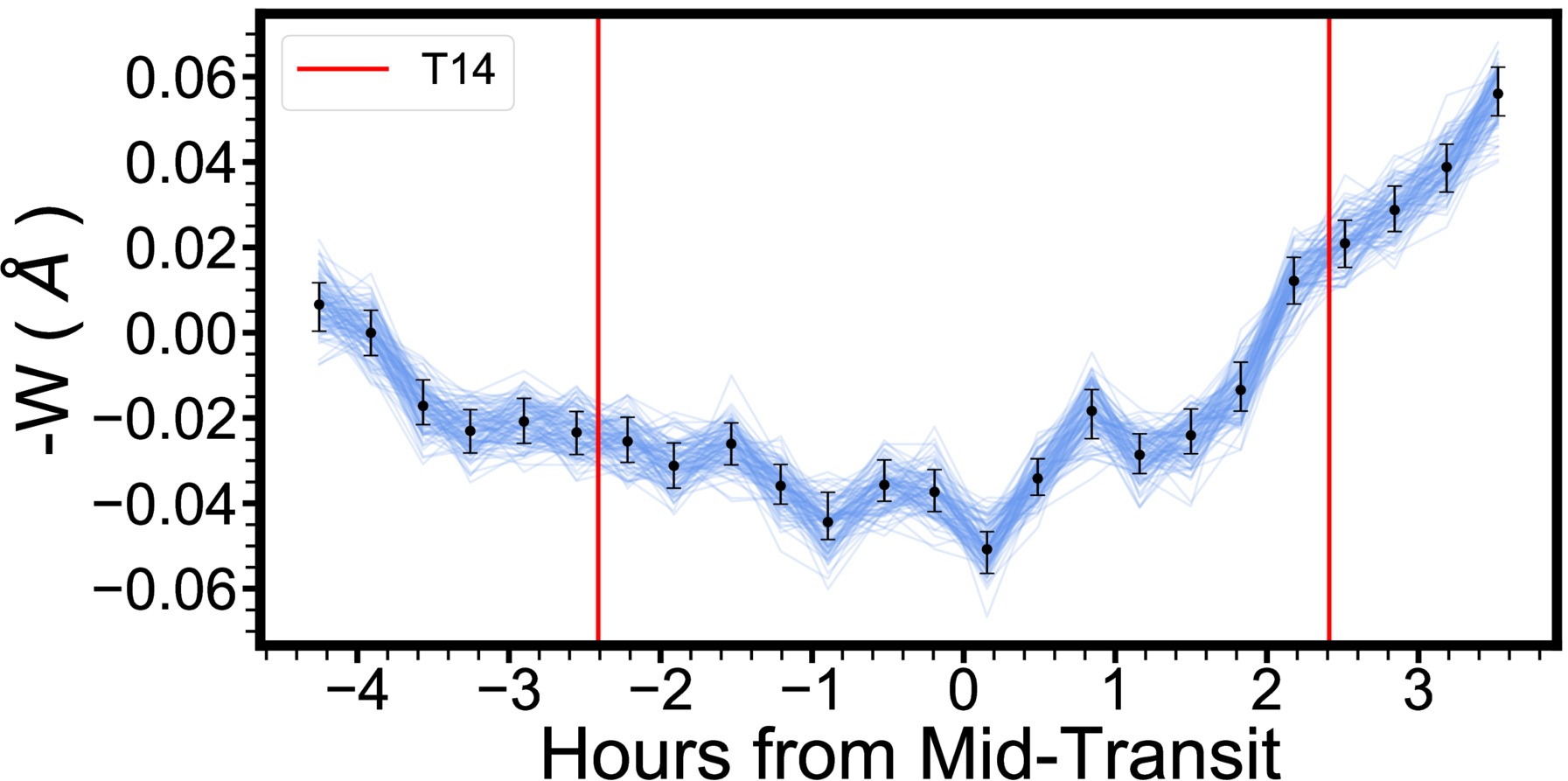 Equivalent widths of Hα for HIP 67522 b spanning observations on 2021 May 14 UT. Each of the 100 overlapping blue lines represents a single set of realizations from our Monte-Carlo error perturbation. The black dots are the average equivalent width for each time step, with error bars marking a 1σ range of uncertainties. The vertical red lines denote the start and end times of the predicted transit (T14).