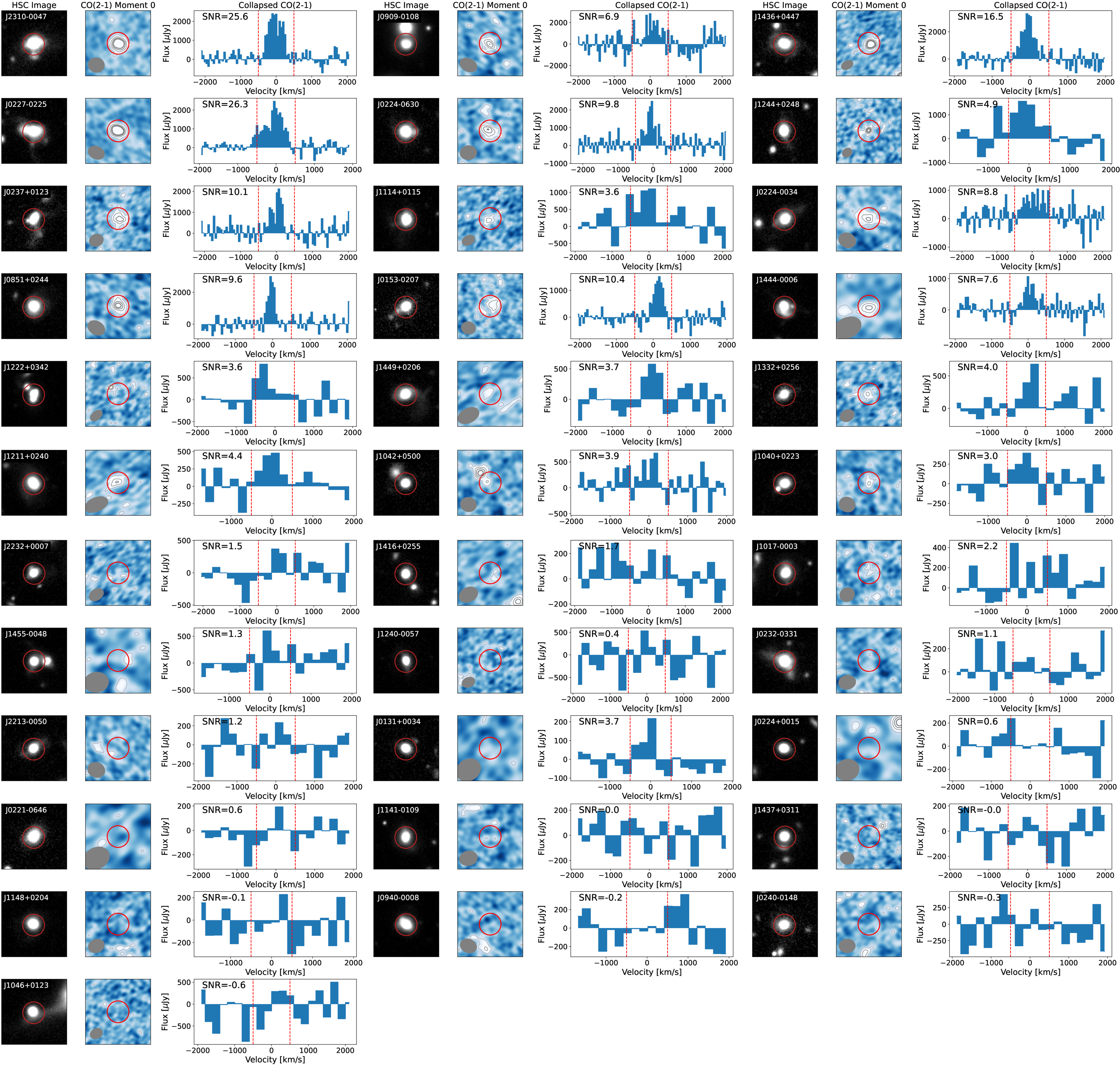 As in Figure 2, but showing only the HSC image, the CO(2–1) Moment 0 map, and the collapsed CO(2–1) spectrum for the entire rest of the new galaxies (sorted by CO(2–1) luminosity) presented in this work.