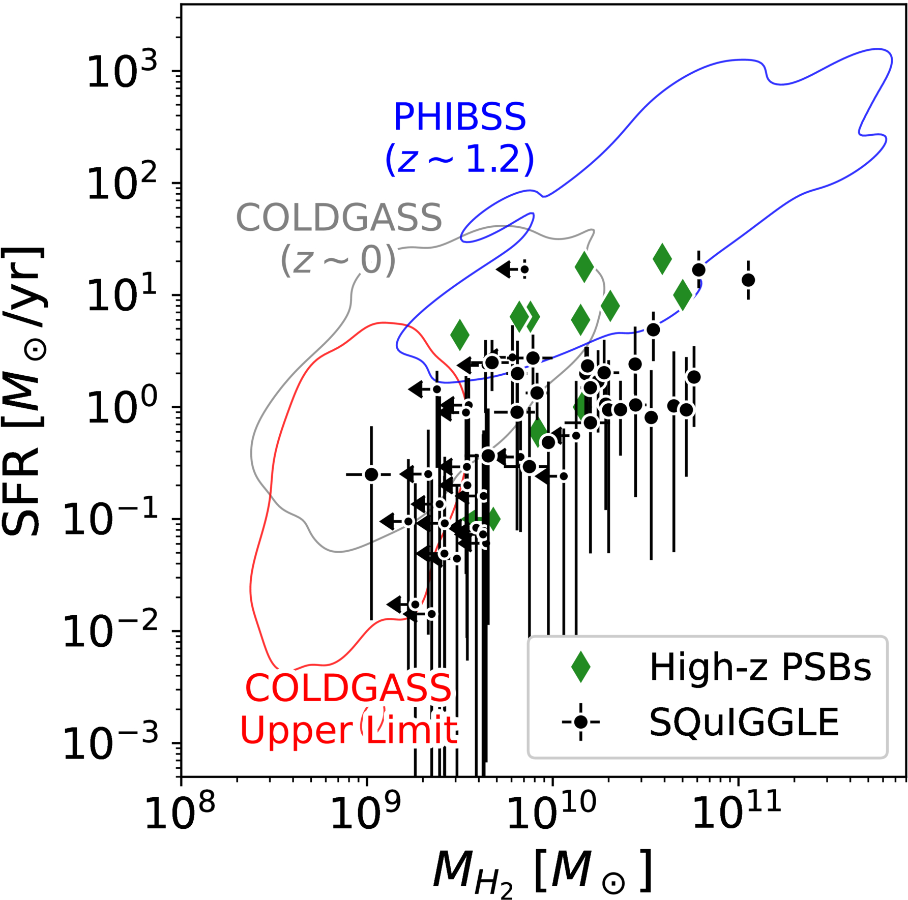 Molecular gas mass vs. SFR. As background contours, we show literature star-forming samples: COLDGASS detected (gray), undetected (red; A. Saintonge et al. 2011), and PHIBSS/PHIBSS2 (blue; L. J. Tacconi et al. 2018; J. Freundlich et al. 2019). As green diamonds, we show literature post-starburst samples (S. Belli et al. 2021; C. Woodrum et al. 2022; P.-F. Wu et al. 2023), with SFRs derived from SED fitting that incorporates MIR data. In black, we show SQuIGG﹩\overrightarrow{L}﹩E, with the SFRs measured in K. A. Suess et al. (2022a). Under the assumptions in that fitting (and with αCO = 4.0), the entire SQuIGG﹩\overrightarrow{L}﹩E sample lies below the SFR–﹩{M}_{{{\rm{H}}}_{2}}﹩ relation, suggesting that star formation in SQuIGG﹩\overrightarrow{L}﹩E post-starburst galaxies at fixed ﹩{M}_{{{\rm{H}}}_{2}}﹩ is low relative to typical star-forming galaxies.