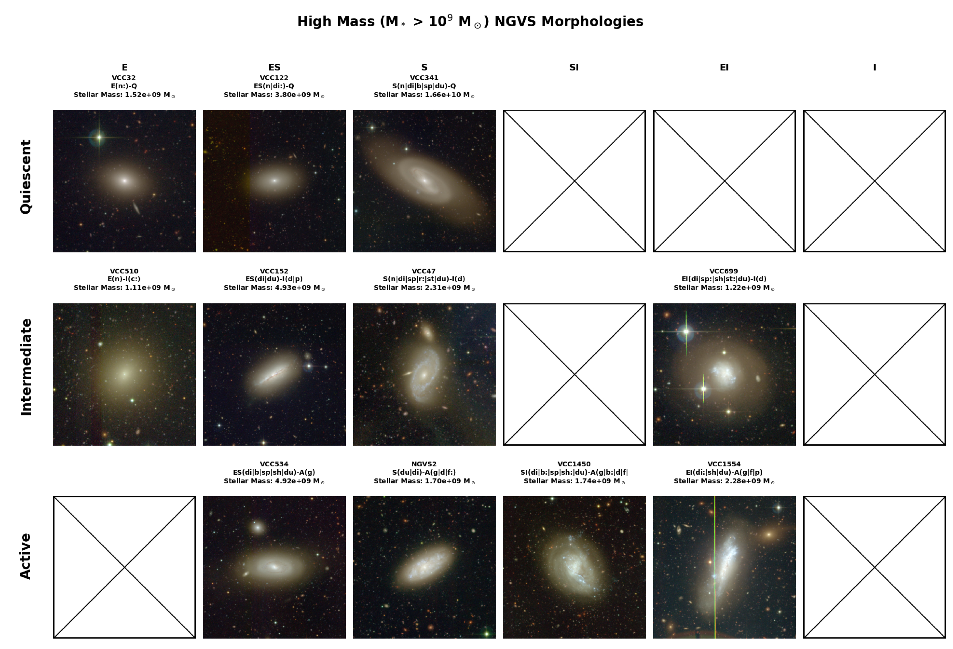 A schematic illustration of the NGVS morphological classification scheme for a selection of high-mass (M* ≥ 109M⊙) galaxies. The six possible structural codes are arranged roughly from early to late types (E → S → I), including “transitional” categories (ES, SI, EI). The three rows correspond to the three possible star formation codes: Quiescent (Q), Intermediate (I), and Active (A). Galaxies are labeled by their NGVS identification number—or VCC number if the galaxy was previously cataloged in the VCC (B. Binggeli et al. 1985)—morphology and stellar mass. Empty entries in this matrix, denoted by an “X,” are either galaxies that do not exist in nature or plausibly exist but are not found in the NGVS, as explained in the text.