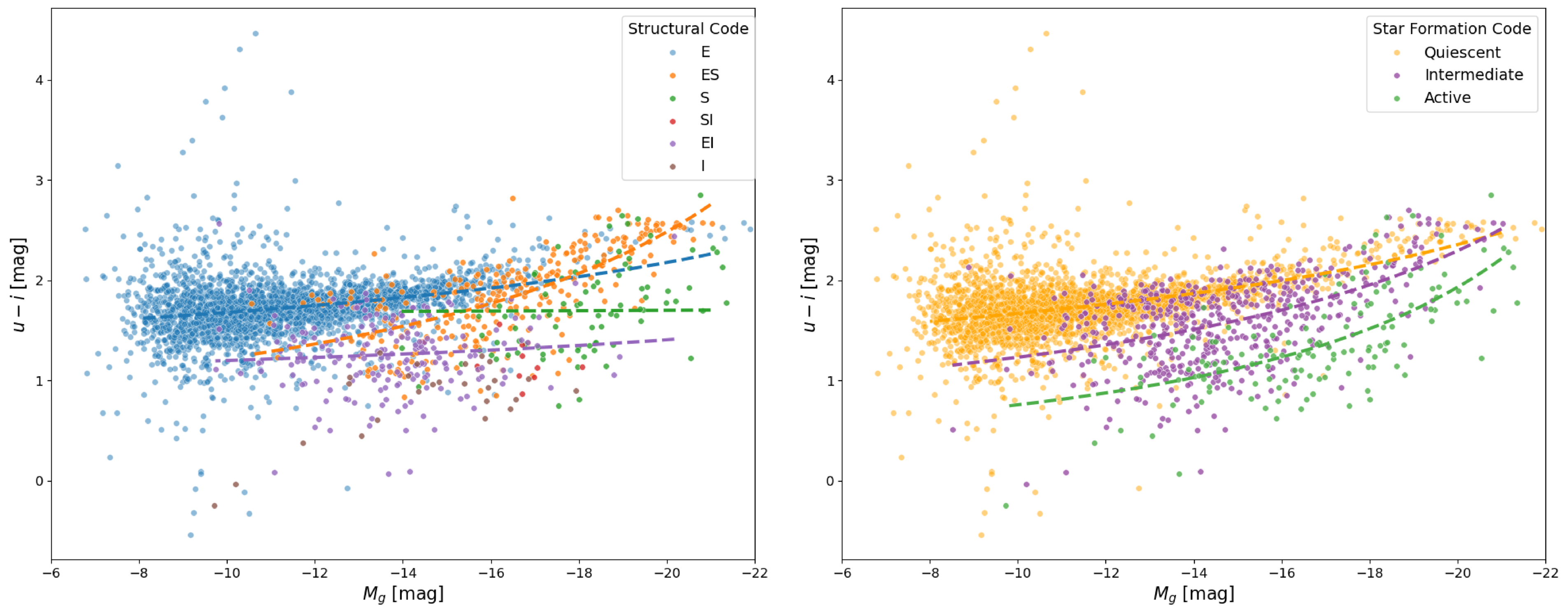 (Left panel) CMDs for 3689 members of the Virgo cluster from the NGVS. The distribution of galaxies in the g–(u-i) plane is shown with symbols color coded according to the NGVS structural code, as indicated in the legend. Note that power-law fits for the SI and I structural codes are not shown due to the sparsity of data. (Right panel) Same as the previous panel, except with color coding based on the NGVS star formation code.