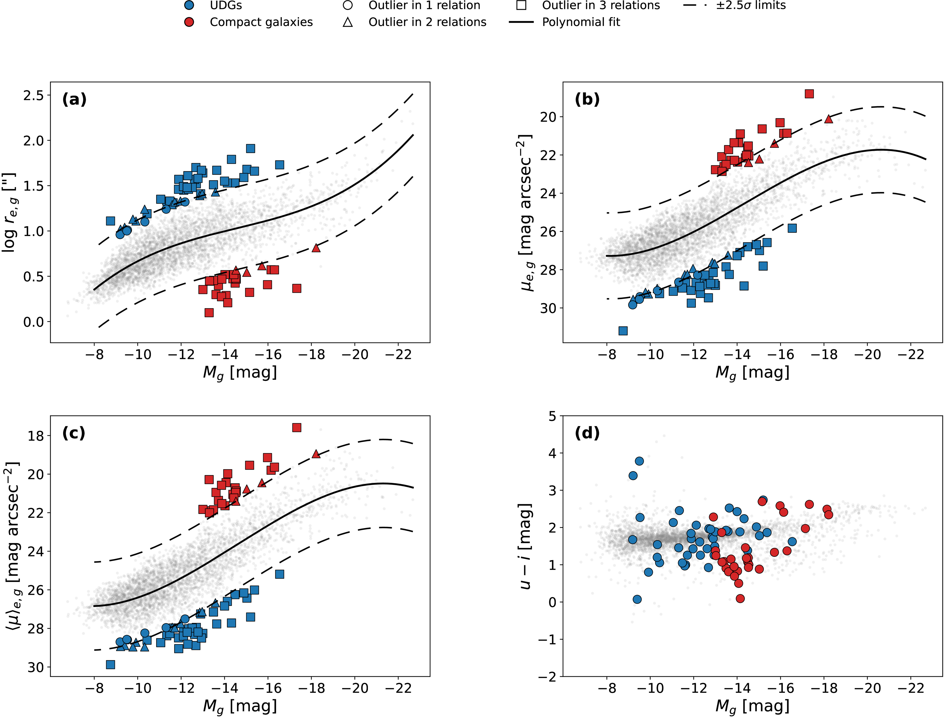 Scaling relations for NGVS galaxies with ﹩\mathrm{log}{M}_{\star }\,\leqslant \,10﹩. Panels: (a) size–magnitude (﹩\mathrm{log}{r}_{e,g}﹩ vs. Mg), (b) effective surface brightness (μe,g vs. Mg), (c) mean surface brightness within one effective radius (〈μ〉e,g vs. Mg), and (d) color–magnitude (u − i vs. Mg). Black curves show polynomial fits to the NGVS population; long-dashed black lines mark the ±2.5σ envelopes. UDG candidates (blue) and compact galaxies (red) are highlighted. Marker shape encodes how many relations the object is an outlier in: circles = 1, triangles = 2, squares = 3. Outliers are defined as points lying outside the ±2.5σ envelope of the corresponding fit.
