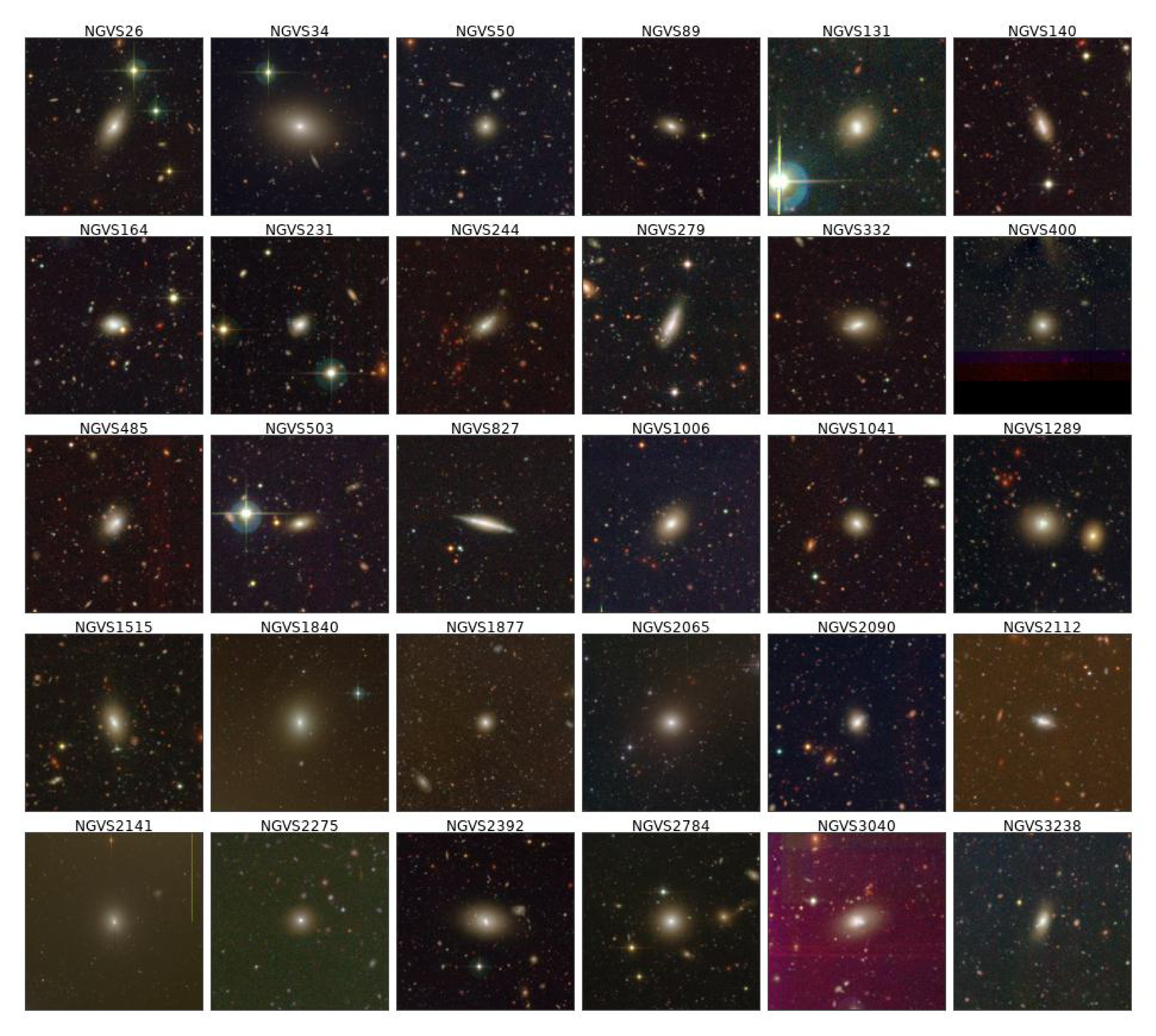 A mosaic of the 30 compact galaxies listed in Table 4. The sample includes both M32-like objects, BCD galaxies, as well as intermediate systems. Each panel measures 1﹩\mathop{.}\limits^{{\rm{^{\prime} }}}﹩5 × 1﹩\mathop{.}\limits^{{\rm{^{\prime} }}}﹩5 with north at the top and east to the left. The sample includes both M32-like objects (e.g., NGVS50 and NGVS400) and BCD galaxies (e.g., NGVS1515 and NGVS231).