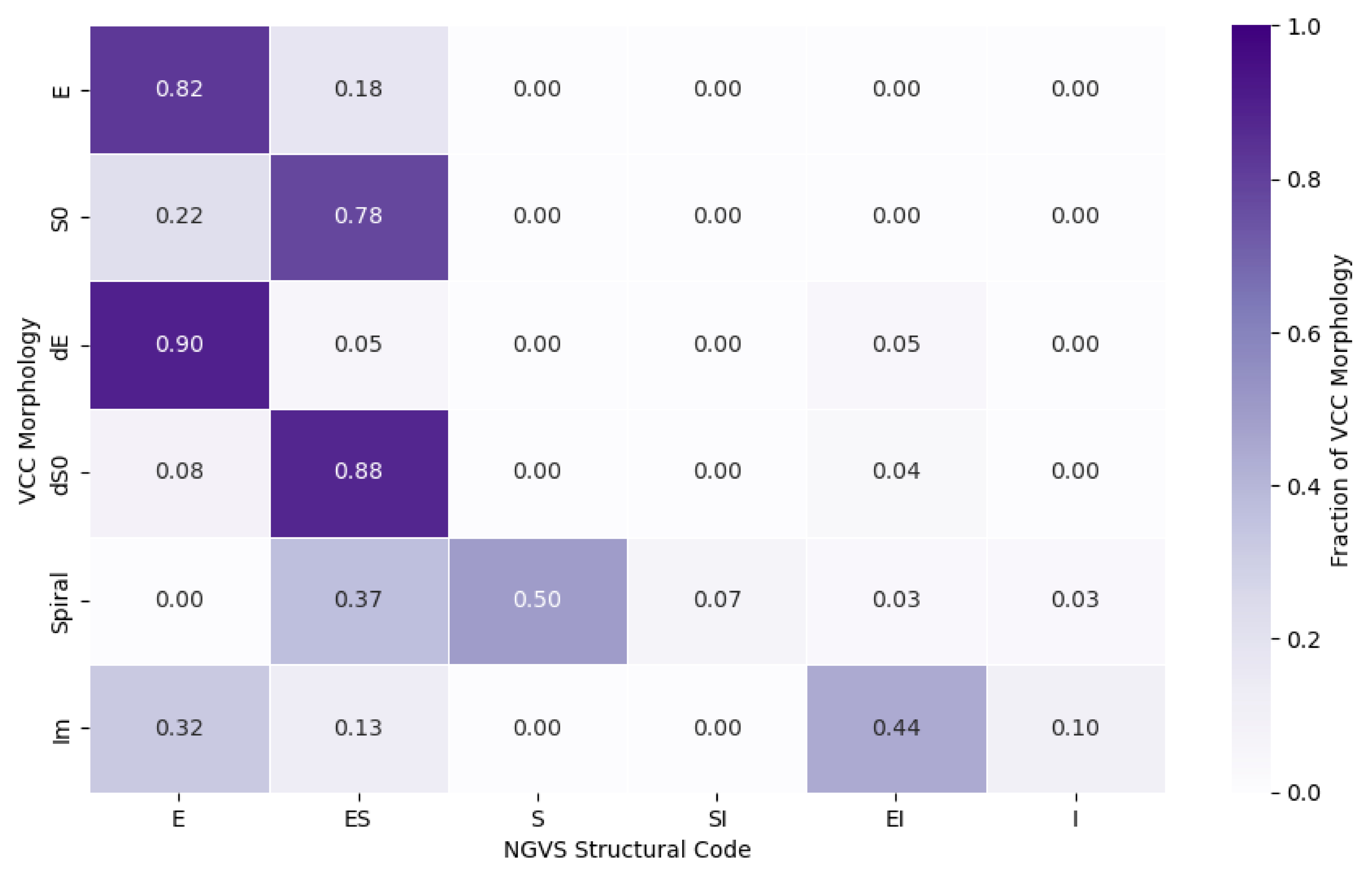 Fractional confusion matrix comparing VCC and NGVS structural classifications. Each row corresponds to a VCC morphological class, and the color shading indicates the fraction of galaxies assigned to each NGVS structural category.