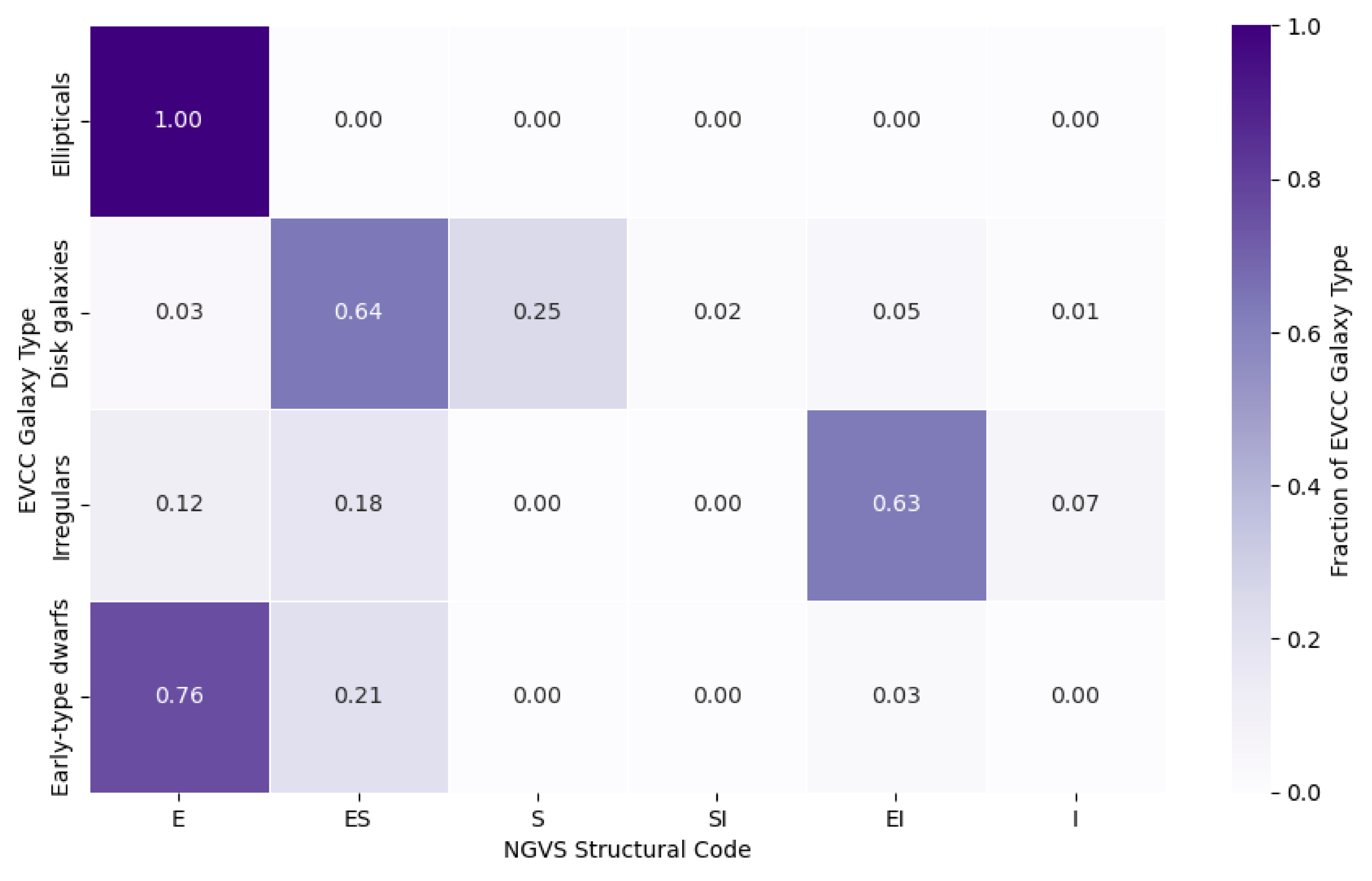 Same as Figure 5 for comparing the primary morphological classifications in the EVCC with NGVS structural codes.