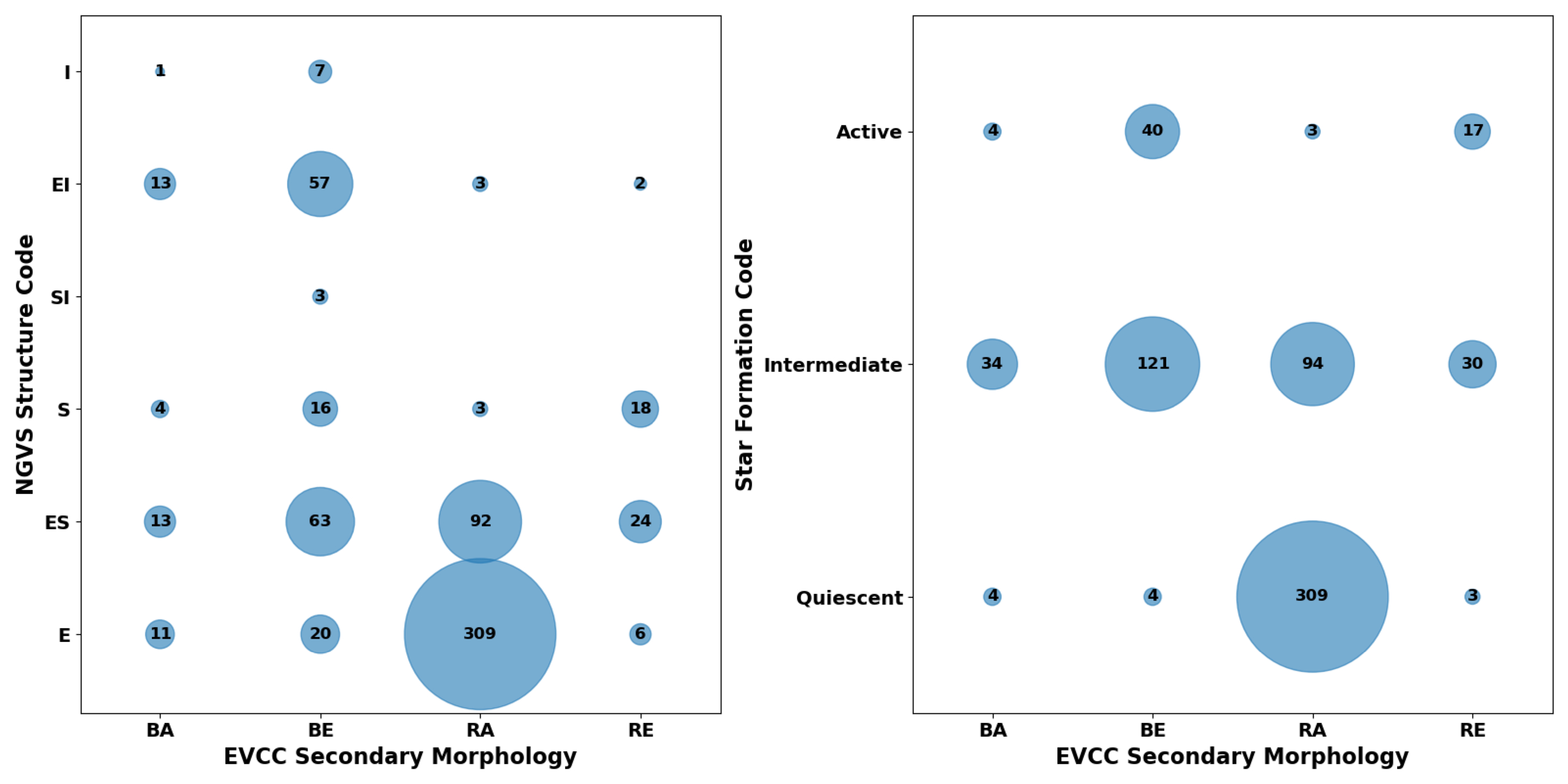 Secondary morphologies from the EVCC compared to our structural and star formation codes (left and right panels, respectively). The symbol size is proportional to the number of galaxies at each point on this grid, with the number of galaxies labeled in each case. Note that most of the 661 galaxies in this comparison have either RA or BE morphologies in the EVCC.