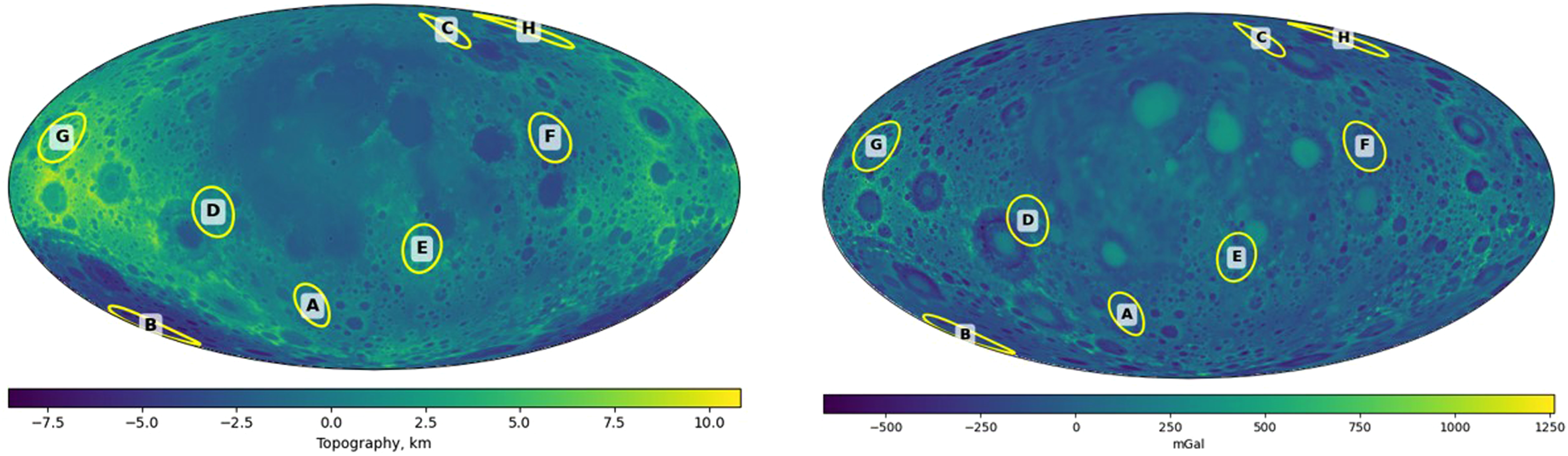 The topographic and gravity field model employed to derive the thickness of cryptomaria basalts. Yellow labels A through H mark specific regions where the presence of cryptomaria has already been established.