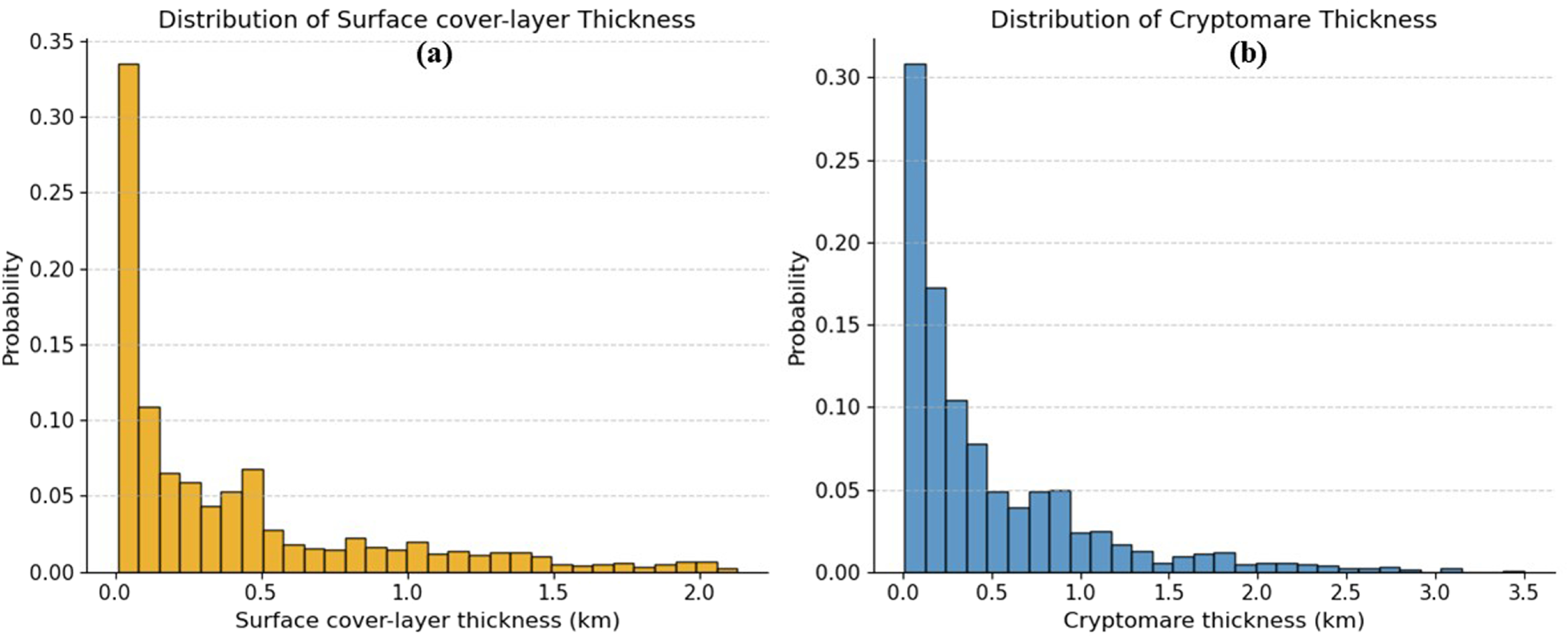 The probability distribution histogram of surface cover-layer and cryptomaria thickness based on three-layer structure-density model inversion.