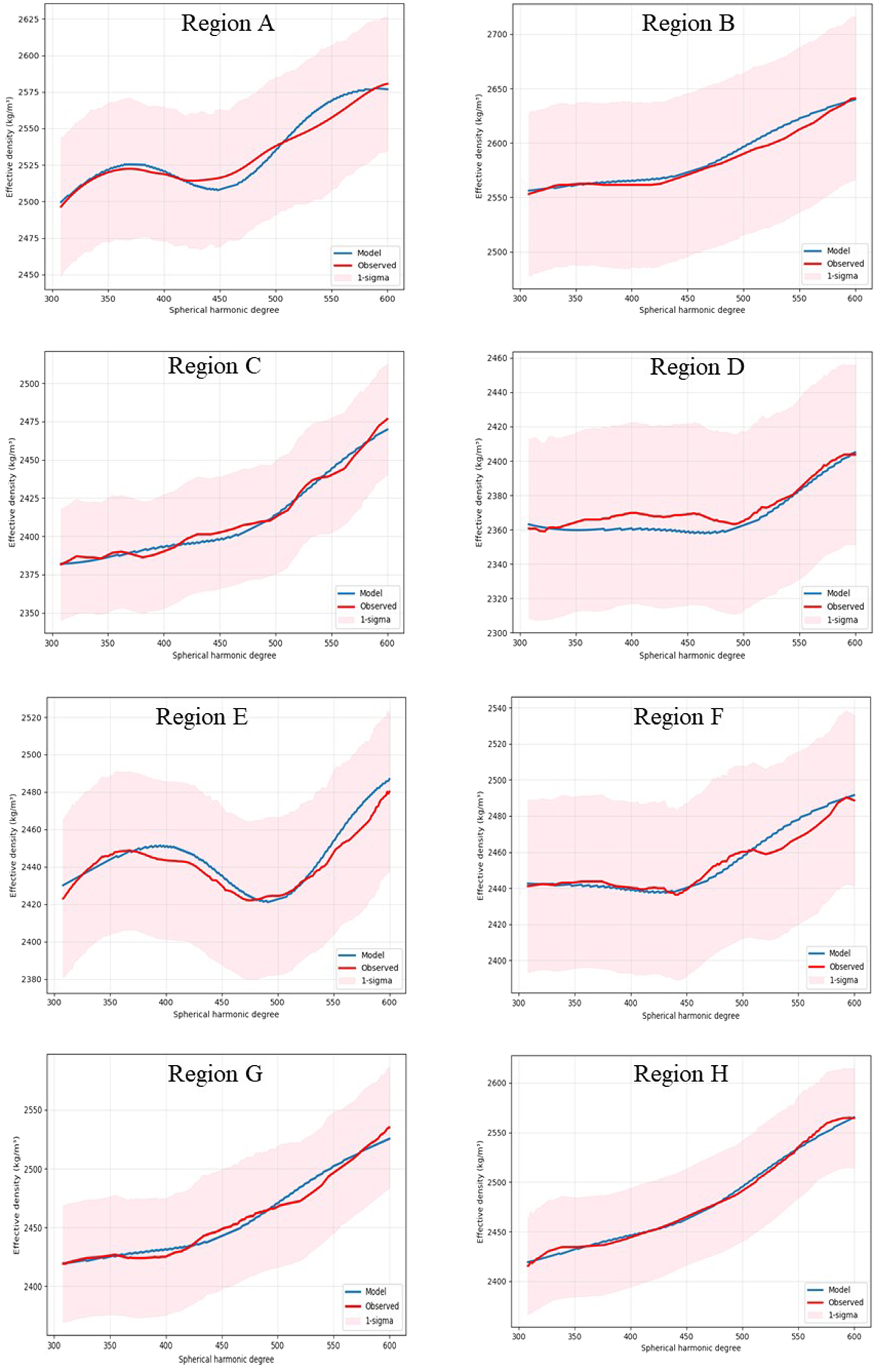 Fitting curves of the optimal model density spectra and observed density spectra in eight cryptomaria regions.