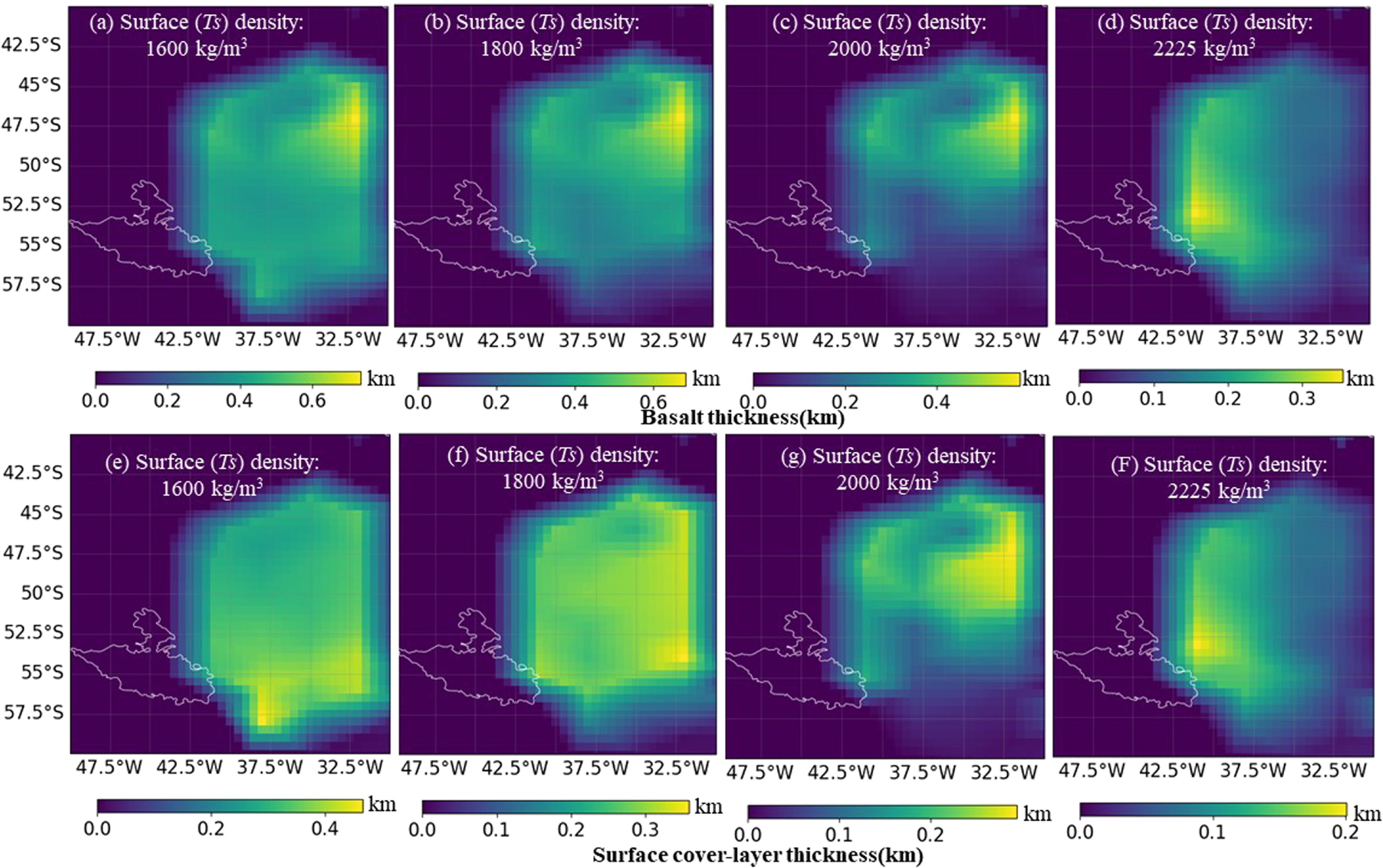 Reference map showing the distribution of lunar basalt and surface cover-layer thickness in the cryptomaria region under varying surface cover-layer densities.