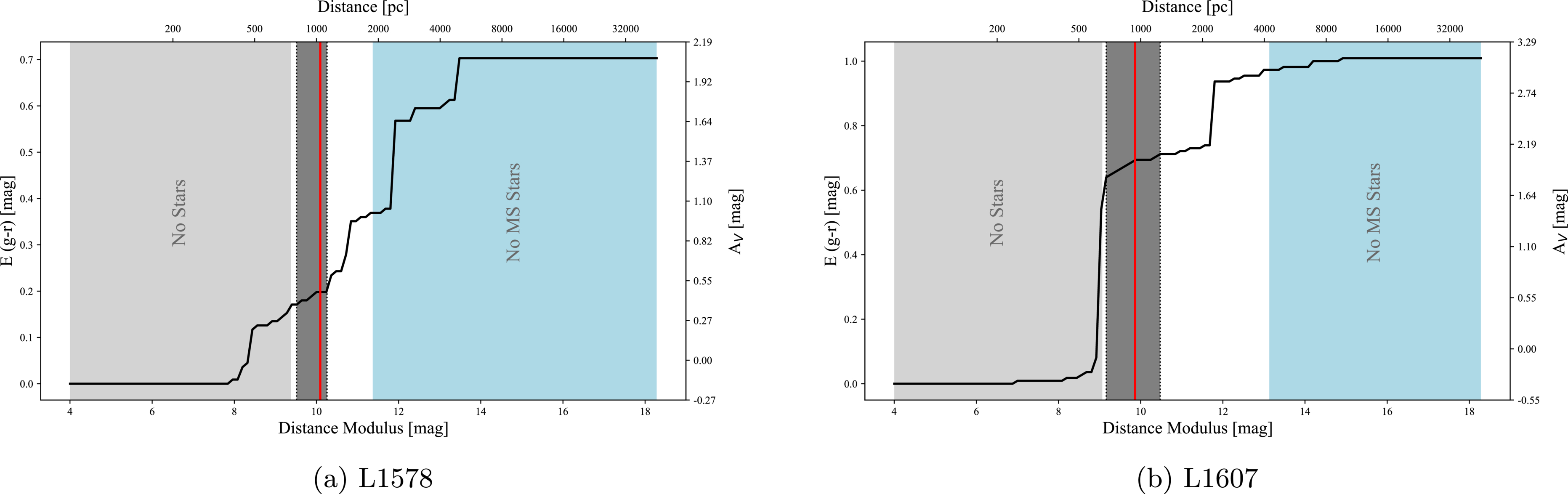 Plots of reddening as a function of distance modulus along sightlines for the two clouds L1578 and L1607. The solid shaded region bounded by two vertical dotted lines marks the probable region of residence of the cloud, in each of the plots. The vertical solid line within the shaded region denotes the calculated median distance (1043 pc for L1578 and 938 pc for L1607) for the respective molecular cloud.