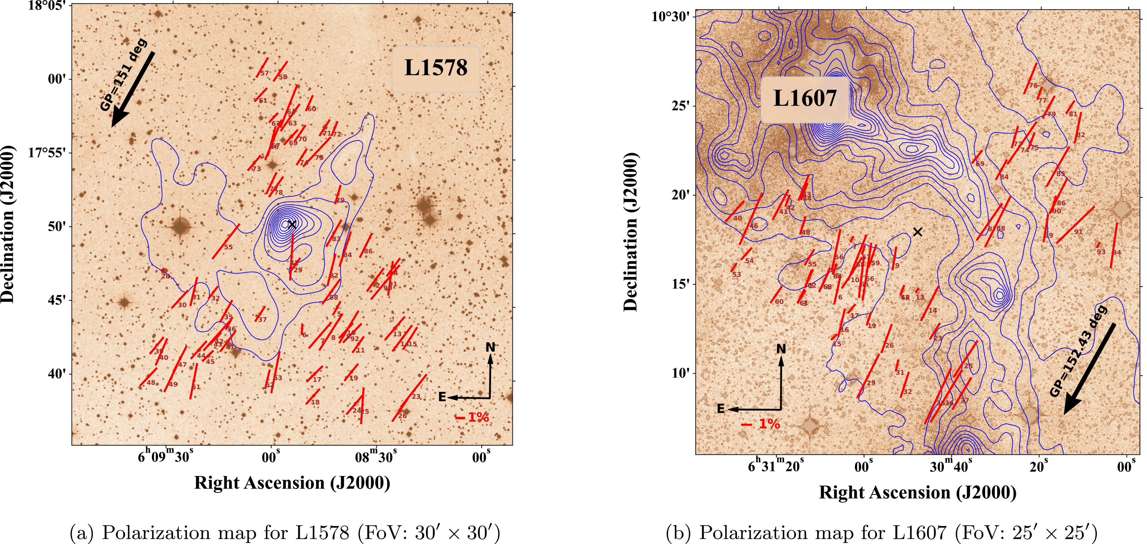 Polarization maps: the polarization vectors for the field stars are shown as red line segments overlaid on the images of the respective regions, covering an area of 30 × 30 arcmin2 for L1578 and 25 × 25 arcmin2 for L1607. A reference vector equivalent to 1% polarization is displayed on each map. The center of the cloud is marked with a “×” and the orientation of the Galactic Plane is represented by a black vector on the maps. Contours of the Herschel SPIRE 500 μm dust continuum emission are also overlaid on the maps. For L1578, the contour levels range from 1.4 to 68.8 MJy sr−1, with a step size of 2.9 MJy sr−1, while for L1607, the levels range from 4.5 to 147.7 MJy sr−1 with a step size of 3.7 MJy sr−1. The numbers beside each polarization vector refer to the number of the star in Tables A2 and A3, which contains their detailed information.