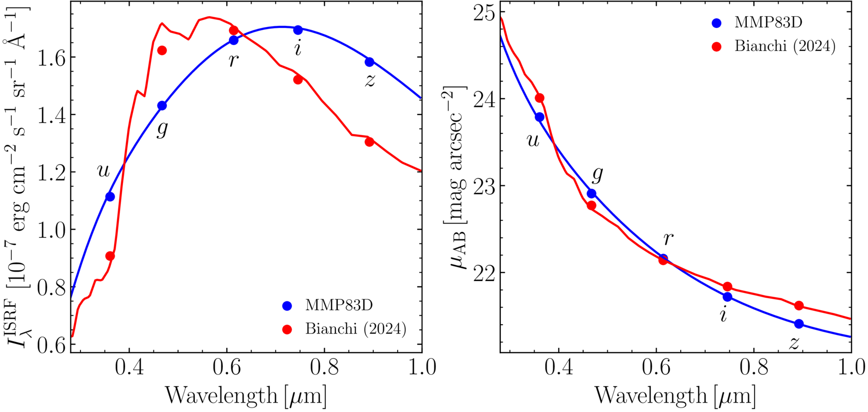 SEDs of the two ISRF models. The left and right panels show the SEDs in surface brightness units of erg cm−2 s−1 sr−1 Å−1 and mag arcsec−2, respectively. The models of J. S. Mathis et al. (1983; as updated by B. T. Draine 2011) and S. Bianchi (2024) are plotted as blue and red curves, respectively. The blue and red filled circles indicate the intensities at the central wavelengths of the SDSS bands, calculated by weighting with the SDSS filter functions.