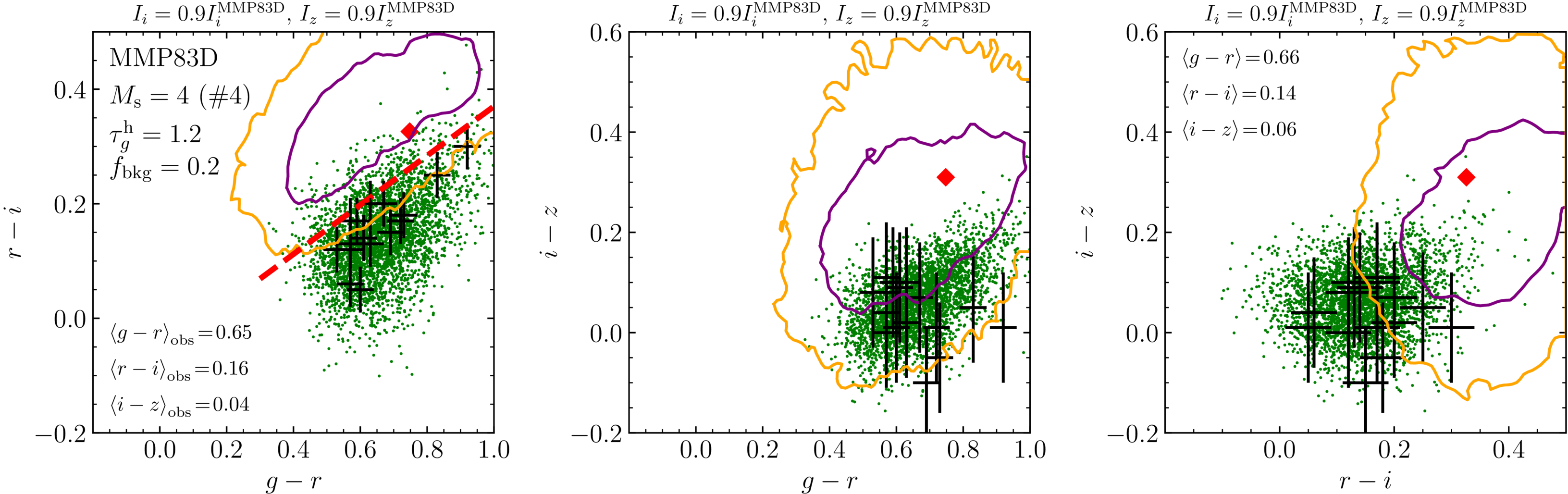 Effect of differential photometry in color–color diagrams. Results are shown for a realization with Ms = 4 and ﹩{\tau }_{g}^{{\rm{h}}}=1.2﹩, assuming the ISRF of MMP83D. The panels are the same as the middle row of Figure 6, except that differential photometry is applied using Equation (7) with τ0 = 0. The background signal is set to fdiff = 0.2 of the ISRF.
