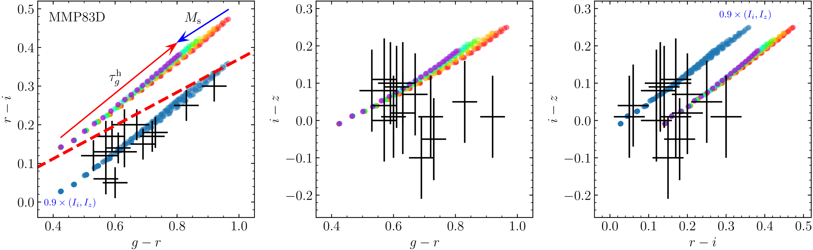 Mean color–color diagrams constructed for ﹩{\tau }_{g}^{{\rm{h}}}=0.2﹩–4.0 and Ms = 0.5–20. Rainbow-colored dots show the simulation results with the unmodified MMP83D ISRF, while light blue dots represent cases where the incident ISRF in the i and z bands is scaled down by a factor of 0.9 to reproduce the observed data. Each dot represents the average across 10 realizations for a given combination of ﹩{\tau }_{g}^{{\rm{h}}}﹩ and Ms, as in Figures 3 and 4. In the rainbow-colored series, each color corresponds to a fixed Ms as ﹩{\tau }_{g}^{{\rm{h}}}﹩ varies. The red arrow indicates the color trend with increasing ﹩{\tau }_{g}^{{\rm{h}}}﹩, while the blue arrow show the trend with increasing Ms. The black crosses mark the observational results of J. Román et al. (2020). In the left panel (r − i versus g − r), the red dashed line denotes the empirical relation used by J. Román et al. (2020) to separate cirrus clouds from extragalactic LSB features. The reddening with increasing ﹩{\tau }_{g}^{{\rm{h}}}﹩ is due to stronger extinction at shorter wavelengths, whereas the blueing with increasing Ms results from the larger volume fraction of low-density regions.