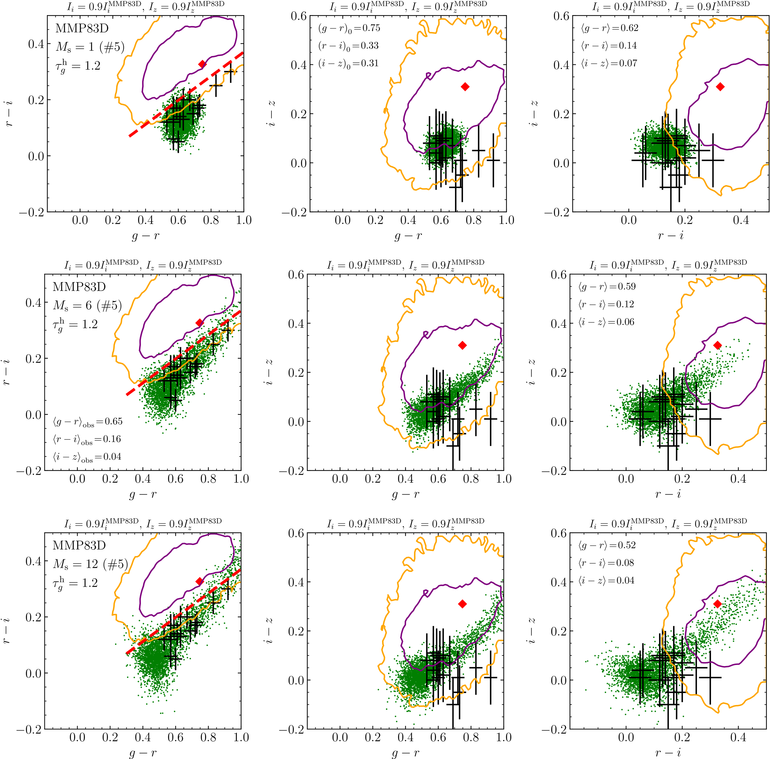 Color–color diagram variations with changing Ms. The Mach numbers are set to 1, 6, and 12 in the top, middle, and bottom panels, respectively, with the cloud optical depth fixed at ﹩{\tau }_{g}^{{\rm{h}}}=1.2﹩. The modified SED of the MMP83D SED was assumed. Green dots show the simulation results of scattered light, while red diamonds indicate the colors of the incident ISRF. Observational results from the Stripe 82 region and external galaxy samples from J. Román et al. (2020) are also shown, as in Figure 6. The initial ISRF colors, the median simulated colors, and the mean observed colors are indicated.