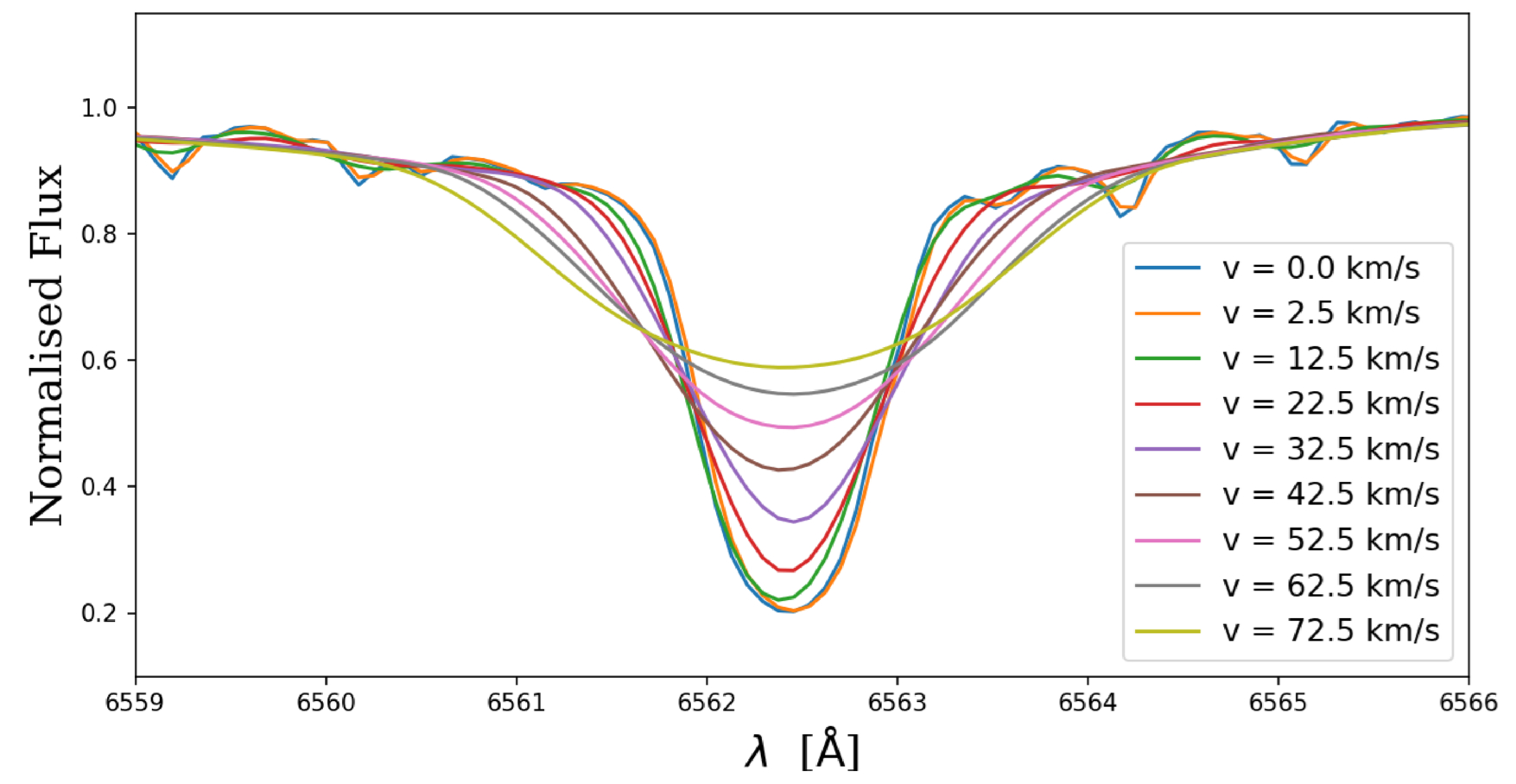 Synthetic line profiles with varying rotational velocities (vsini). The iSTARMOD code has been applied to an example Hα absorption line, taken from a quiescent K2V star. Note that minor and noisy features of the intrinsic profile are erased for v > 10 km s−1.