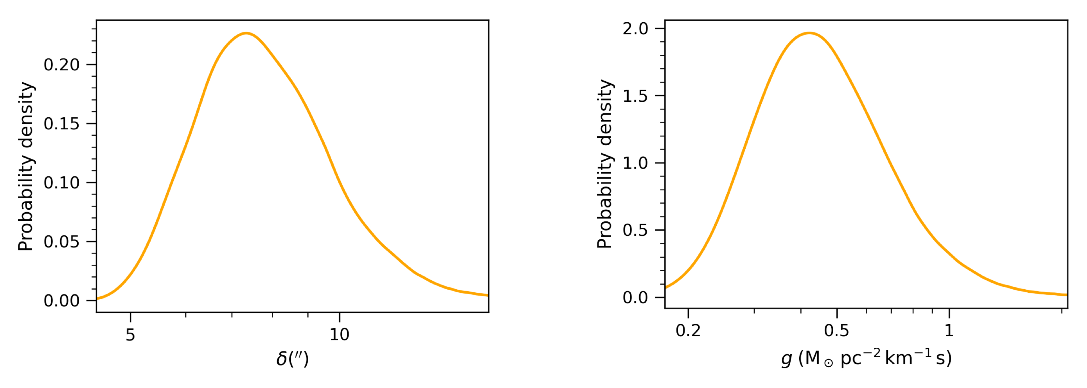 Distributions of deflection angle δ and g smoothed with a Gaussian kernel.