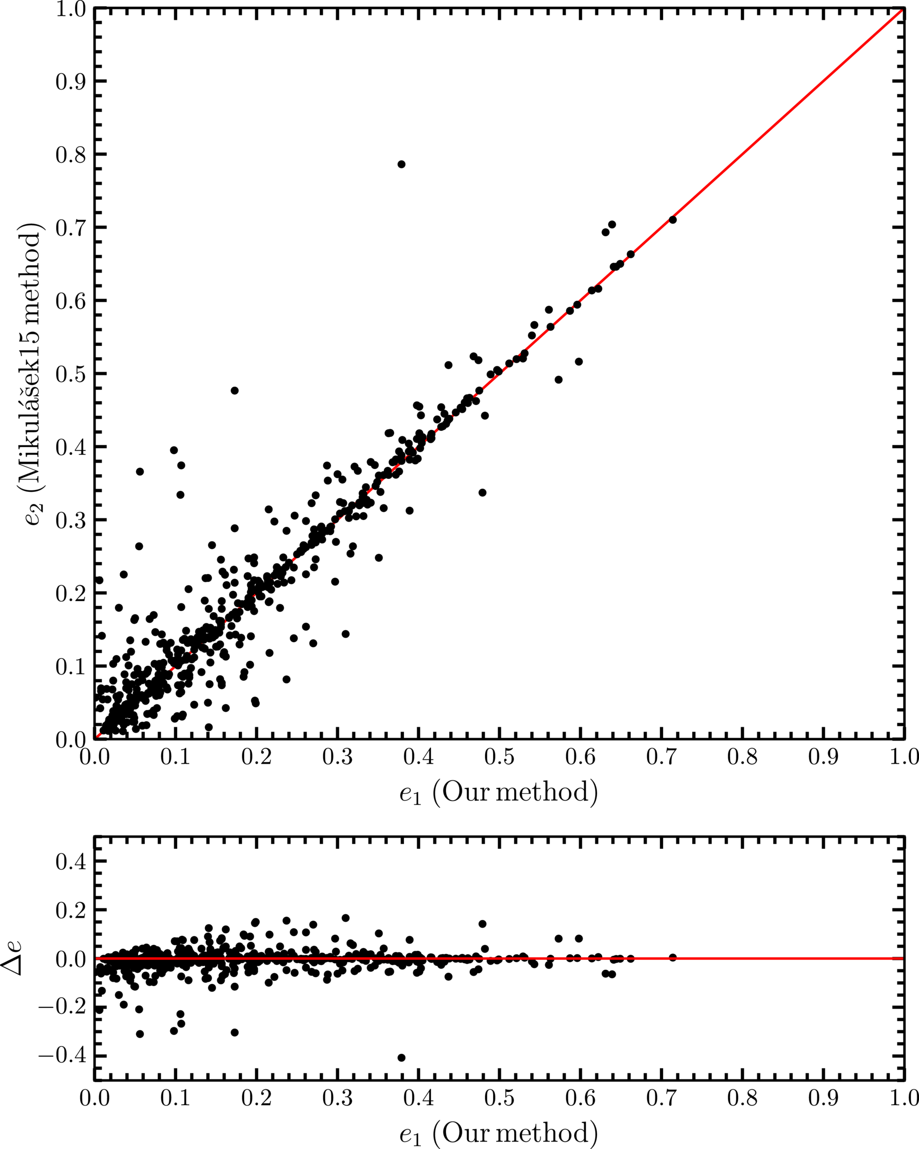 The eccentricity calculated by our method e1 compared with the eccentricity e2 calculated by the method of Z. Mikulášek (2015). The top panels are the comparison diagrams, and the bottom panels are the residual diagrams. The residuals are the values of our calculation minus the Z. Mikulášek (2015) values.