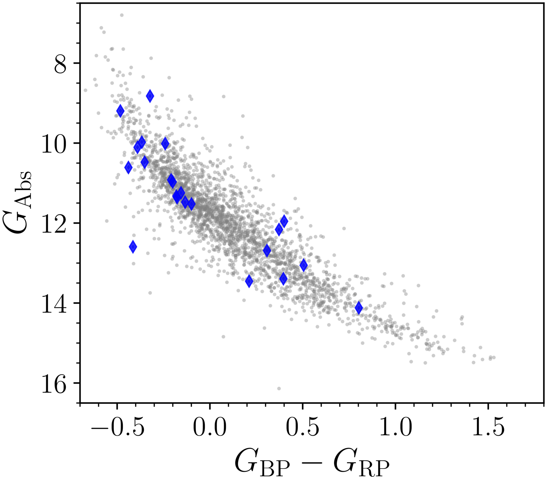 Gaia color–magnitude diagram for the 22 candidate debris disks (blue diamonds), compared to the parent DESI EDR white dwarf sample (gray circles).