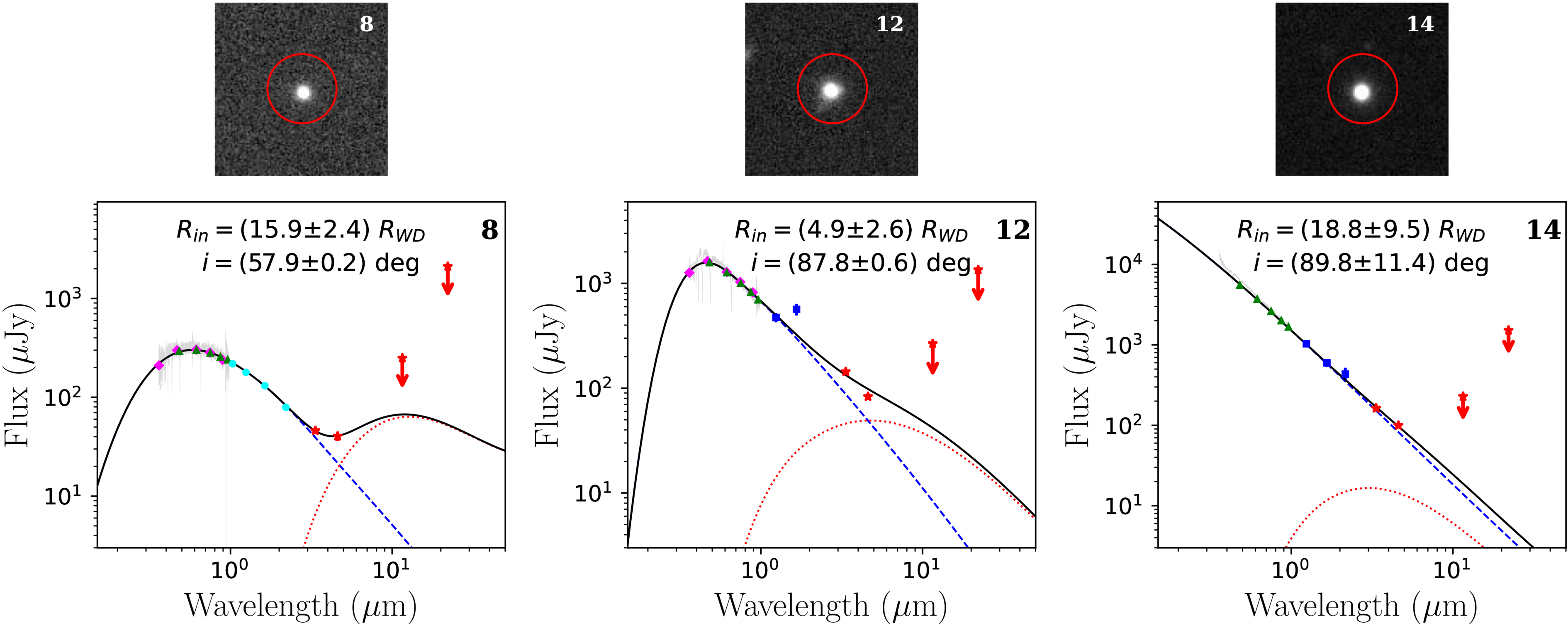 Pan-STARRS z-band images (top row) and SED fits (bottom row) for the three candidate gaseous-debris-disks white dwarfs showing infrared excess. From left to right: WD J0849+0923 (ID = 8), WD J1434+1508 (ID = 12), and WD J1100+7138 (ID = 14). Each z-band image is centered on the DESI source position, with a red circle of 6″ radius indicating the absence of visible contaminants within the typical WISE beam. The SED panels show photometric data from SDSS (magenta diamonds), Pan-STARRS (green triangles), 2MASS (blue squares), UKIDSS (cyan circles), and WISE (red stars), along with the DESI spectrum in gray. The best-fit model (black solid line) includes contributions from the white dwarf photosphere (blue dashed line) and a dusty disk (red dotted line). The derived disk parameters (inner radius Rin and inclination i) are listed.