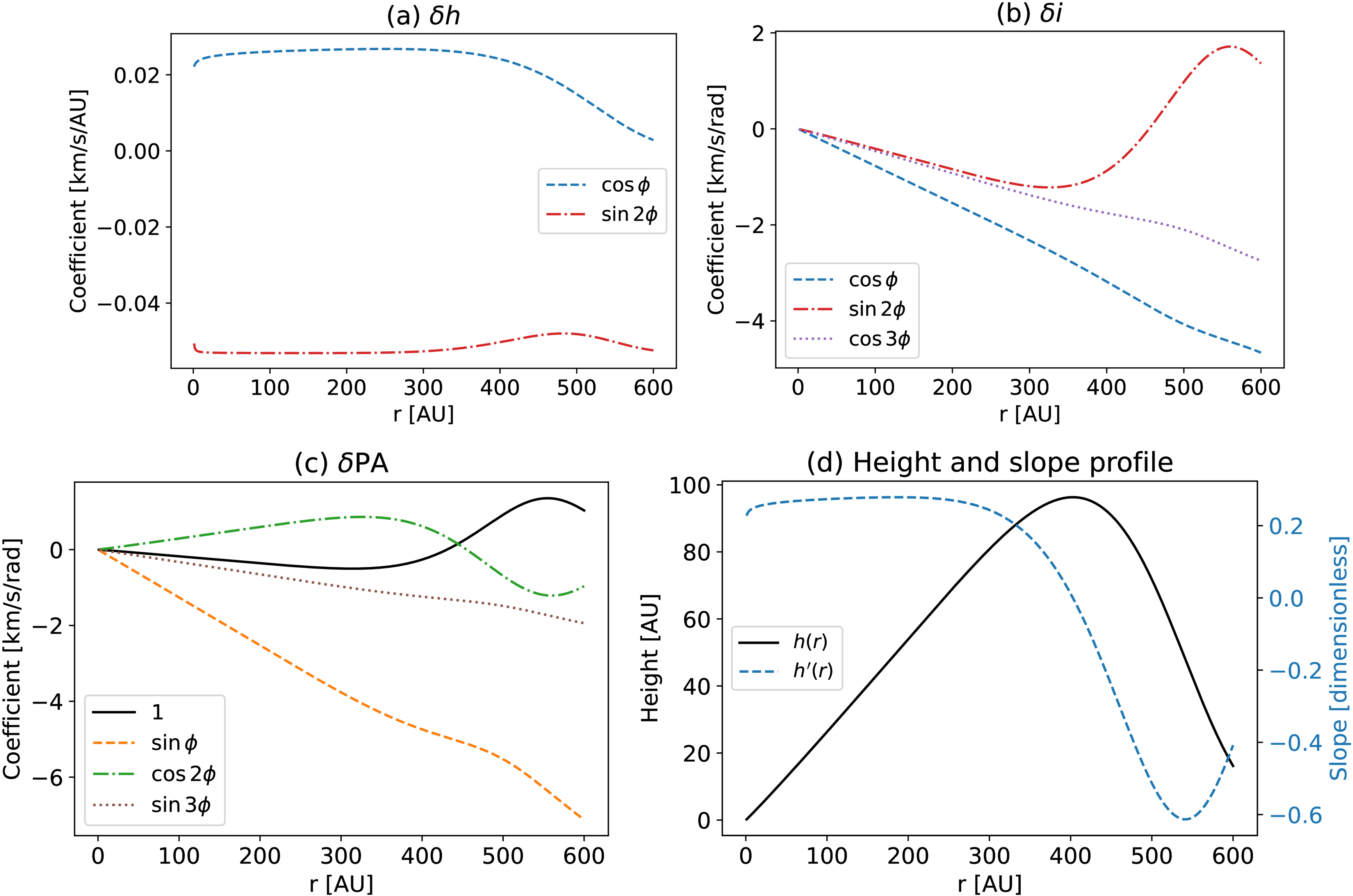 (a)–(c) Radial profiles of the key Fourier coefficients in Equation (56) for perturbations in (a) disk height δh(r), (b) inclination δi, and (c) position angle δPA. (d) Fiducial disk-surface height profile h0(r) (solid) and its radial derivative ﹩{h}_{0}^{{\prime} }(r)﹩ (dashed).