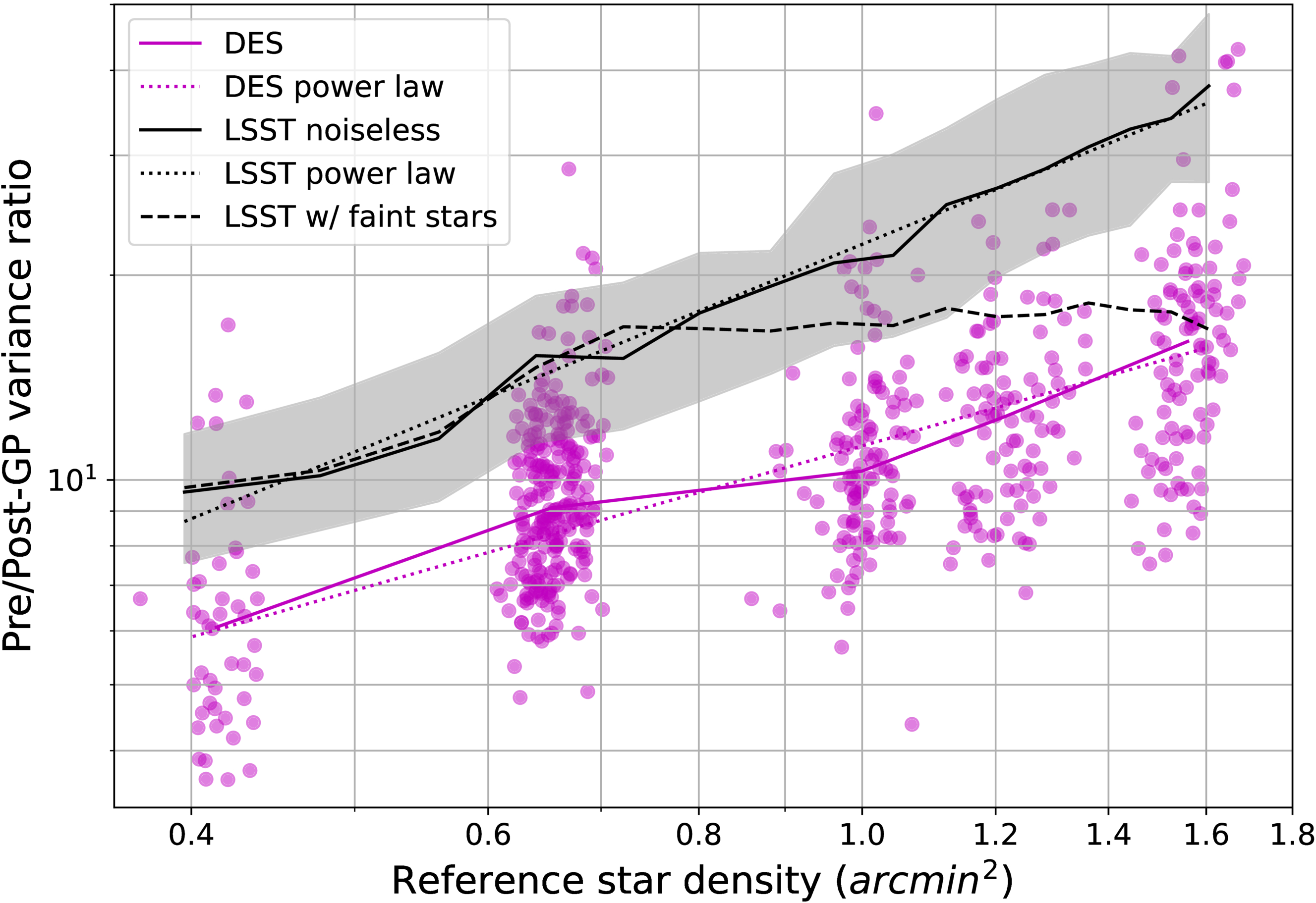 The turbulence variance reduction factor (﹩{C}_{0}^{\rm{pre}\,}/{C}_{0}^{\,\rm{post}}﹩) is plotted as a function of the reference star density on LSST simulations (black) and real DES exposures (purple). The solid black shows the median variance reduction attained for LSST simulations with a fixed 1 mas measurement uncertainty per star. The gray zone represents 1σ exposure-to-exposure rms variation. The simulations shown with black dashed line also include expected magnitude-dependent LSST measurement noise per star, with higher density values representing the use of fainter-than-Gaia reference stars. The black dotted line is a power-law fit to the variance reduction in the noiseless scenario. The magenta dots are individual DES exposures; the solid line, their median value, and the dotted line, a power-law fit.