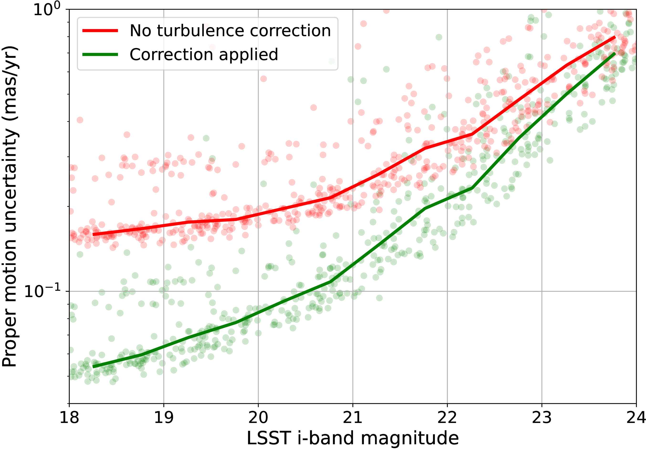 Proper motion errors (in decl.) after 10 yr of LSST for a sample of 1000 randomly drawn sky positions and magnitudes, as a function of the i-band magnitude. Red points represent the scenario where no turbulence correction is applied (10 mas errors added in quadrature to the photon-noise error). Green points reduce the astrometric errors according to the performance of our turbulence reduction code (the astrometric floor is moved from 10 to 3 mas). Continuous lines are medians.