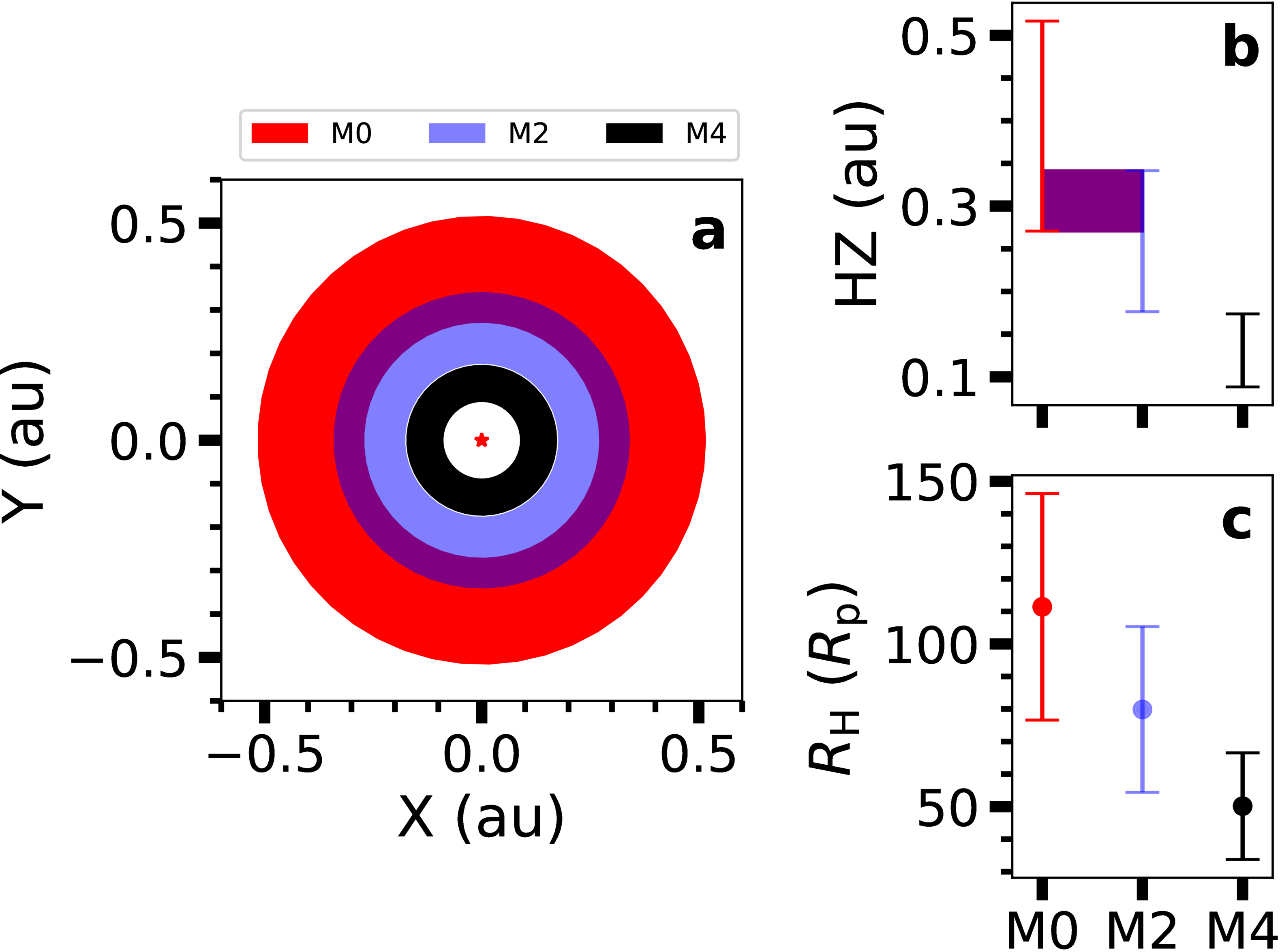 HZs and Hill radii of M0, M2, and M4 stars. (a) Top-down and (b) edge-on views of the HZs around M0 (red), M2 (blue), and M4 (black) dwarfs along with (c) the Hill radius for a prospective 1.0 M⊕ planet at the center of its respective HZ. The overlap of the M0 and M2 HZs is noted in purple in both (a) and (b).