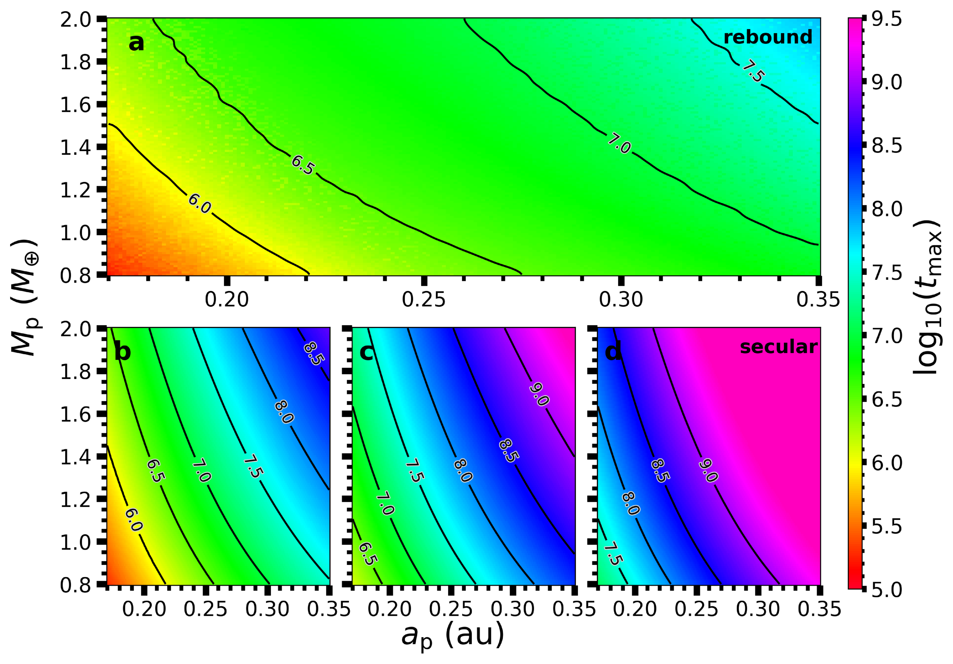 Stability simulation results for a HZ planet–moon orbiting an M2 dwarf. Logarithm of maximum moon lifetime (﹩{\mathrm{log}}_{10}\left[{t}_{{\rm{\max }}}\right]﹩) from simulations considering a range of host planet masses (0.8–2 M⊕) and semimajor axis within the HZ of an M2 dwarf. (a) shows results from N-body simulations using rebound with a tidal time-lag τp of 698 s, while (b–d) show outcomes from secular tidal theory (R. Barnes 2017) with tidal dissipation timescales τp of (b) 698 s, (c) 100 s, and (d) 10 s. Contour lines indicate ﹩{\mathrm{log}}_{10}({t}_{{\rm{\max }}})﹩ values, reflecting the time of moon loss due to tidal migration. Red, yellow, green, and blue regions represent increasingly longer lifetimes while purple regions represent the longest lifetimes.