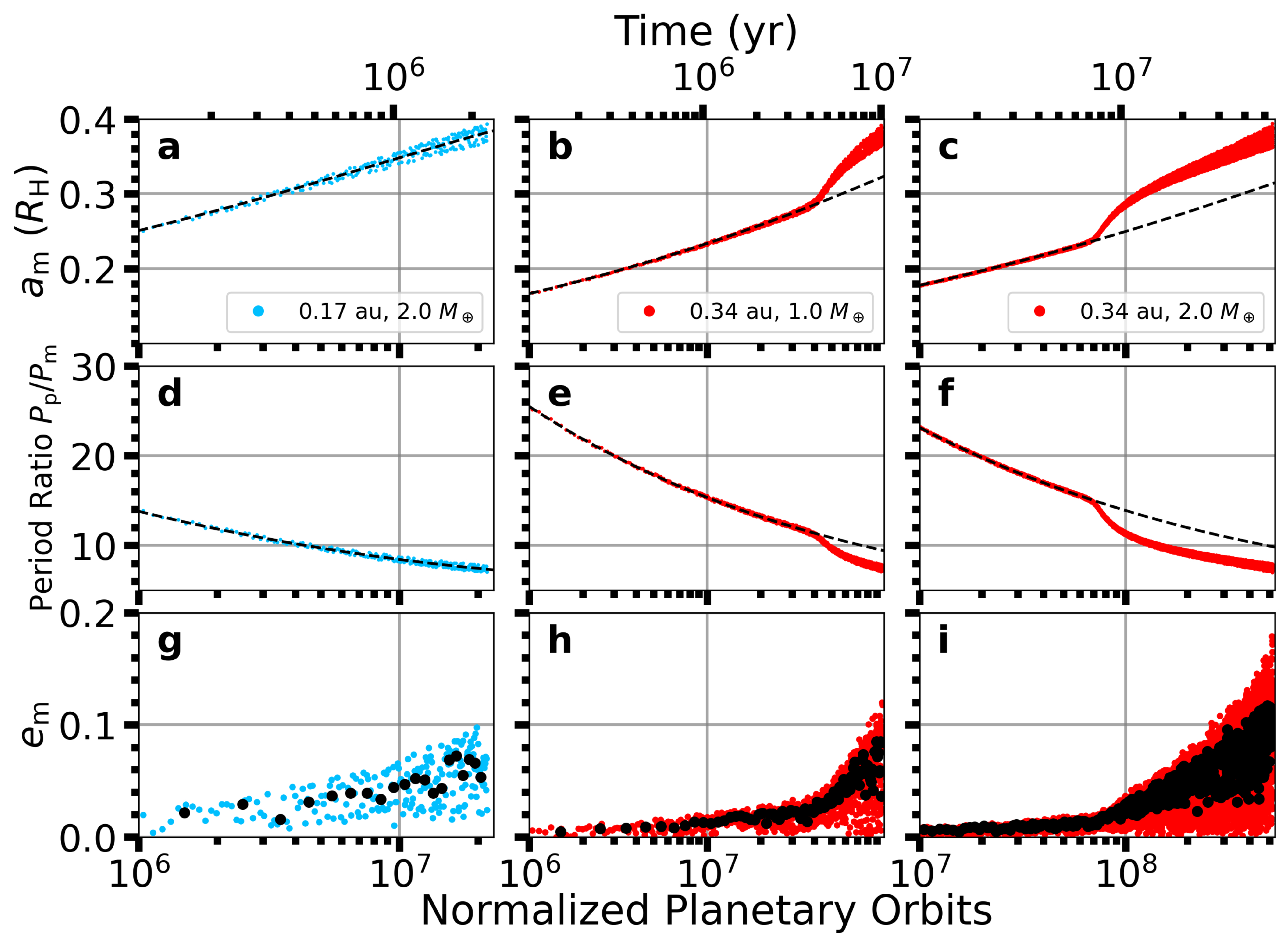 Time evolution for three HZ planet–moon systems orbiting an M2 dwarf. Time evolution of the (a–c) exomoon’s semimajor axis am, (d–f) planet to moon period ratio Pp/Pm, and (g-i) exomoon’s eccentricity em for 3 distinctive points in the parameter space (0.17 au and 2.0 M⊕, 0.34 au and 1.0 M⊕, 0.34 au and 2.0 M⊕) in the M2 case. The bottom x-axis, plotted on a logarithmic scale, shows time normalized by the orbital period of a planet at the inner edge of the HZ (0.17 au) while the top x-axis shows time (in years). The blue and red points signify rebound results while black dashed lines represent results from secular tidal theory. Black dots in the eccentricity panels represent the median value over 1 million orbits.