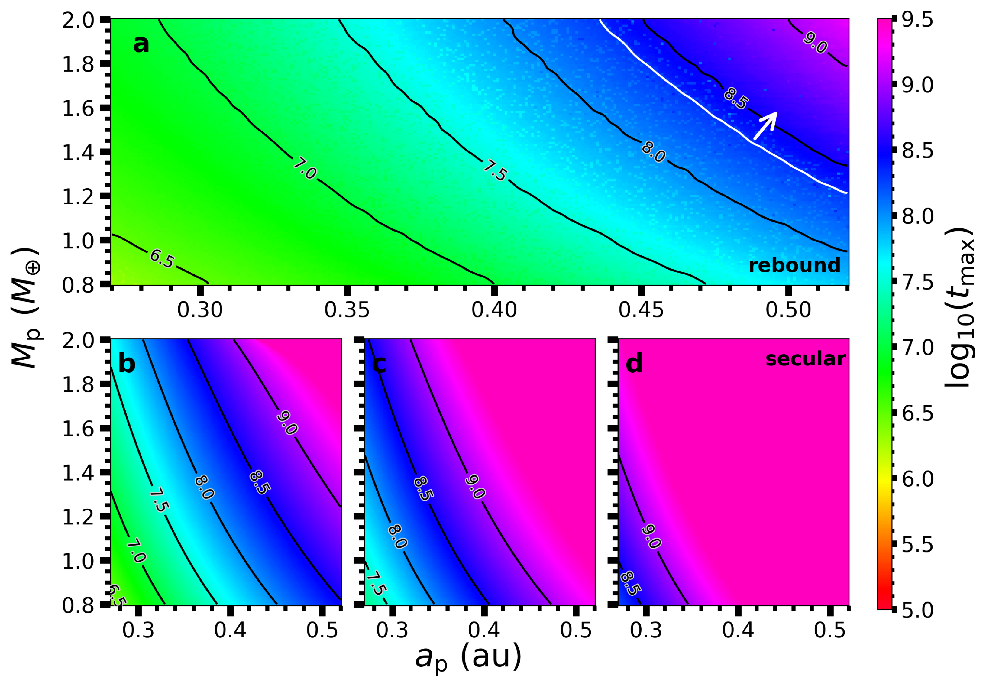 Stability simulation results for a HZ planet–moon orbiting an M0 dwarf. Similar to Figure 2 but for moons orbiting an Earth-sized planet in an M0 system. The white contour in (a) marks the boundary beyond which the lifetimes are extrapolated, as indicated by the arrow. The maximum lifetime in (a) is ≈9.2 in ﹩{\mathrm{log}}_{10}(t)﹩.